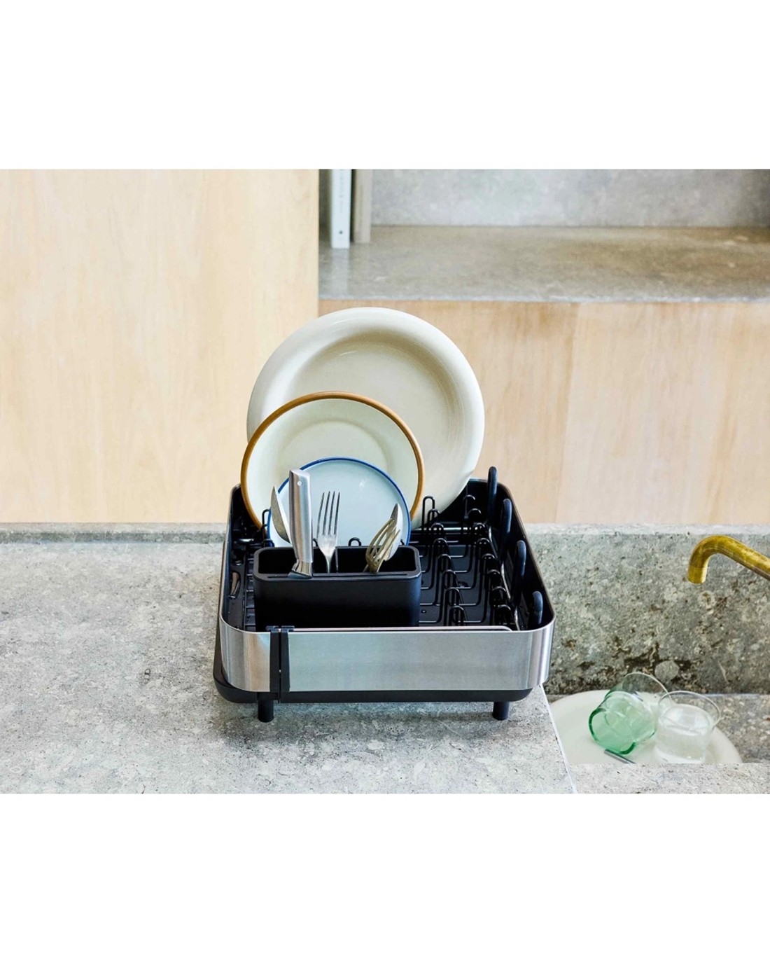 This versatile dish rack includes a dedicated stemware rail to keep wine glasses secure and protected during drying, with elevated placement for optimal drainage. The pull-out drying shelf and removable inner racks facilitate easy cleaning and maintenance. The adjustable spout can be repositioned in three different ways to effectively drain excess water into your sink, ensuring your countertop stays dry and tidy. Capable of holding up to a 16-piece dinner set, it also features a specialised cutlery pot with a knife slot for safe and organised utensil storage. When folded flat, the stemware rail can also support bottles during draining, adding to its multifunctionality.