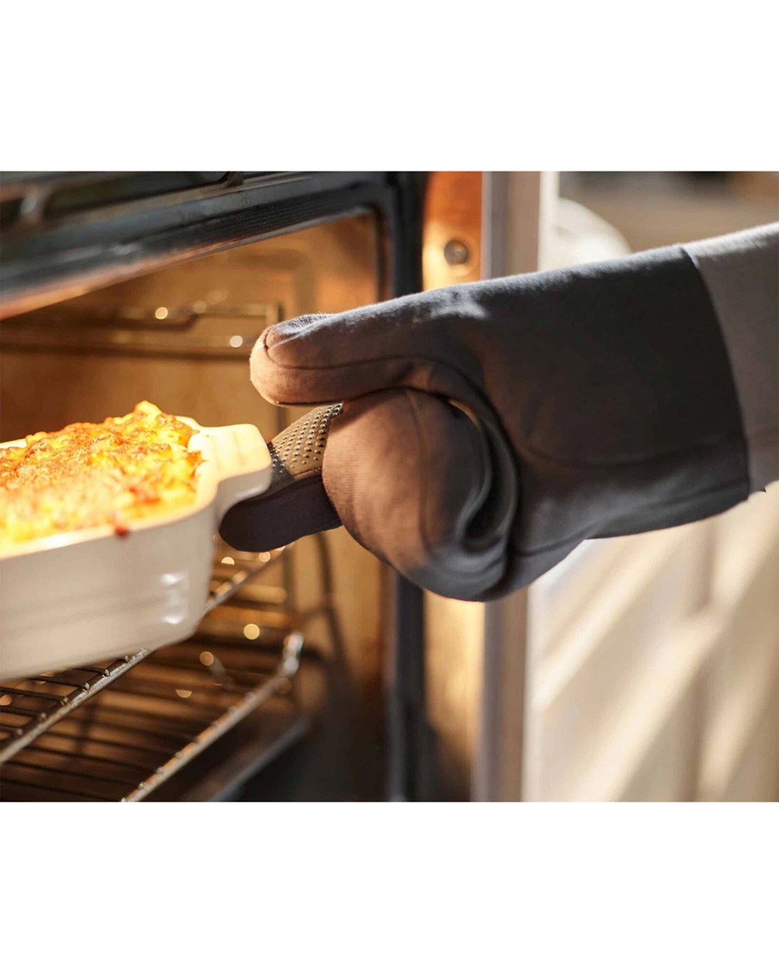 Constructed with a combination of high-heat resistant silicone and durable fabric, this glove offers reliable protection against heat while maintaining flexibility. The padded cotton cuff adds extra comfort during extended use, and the stylish grey colour complements modern kitchen aesthetics.