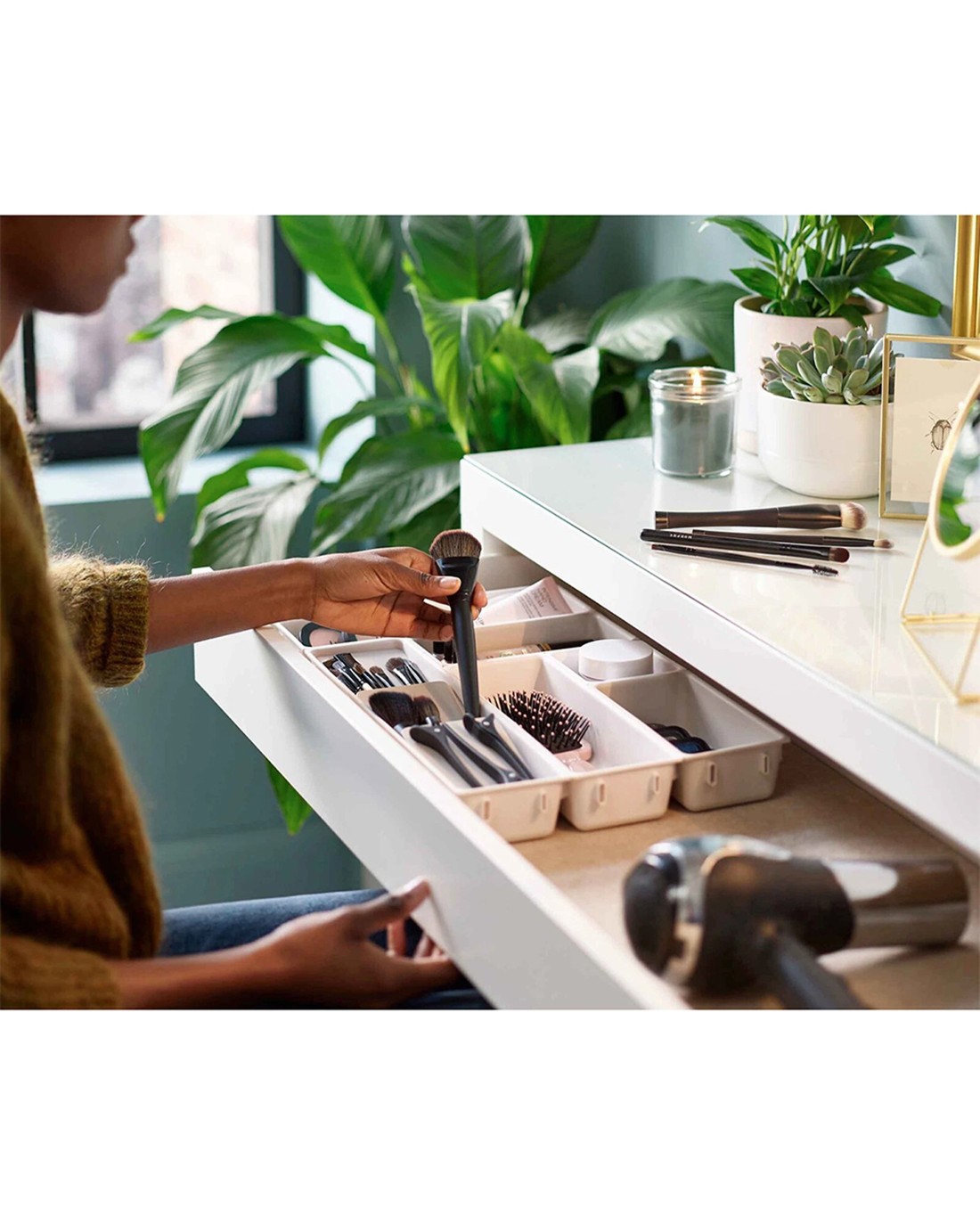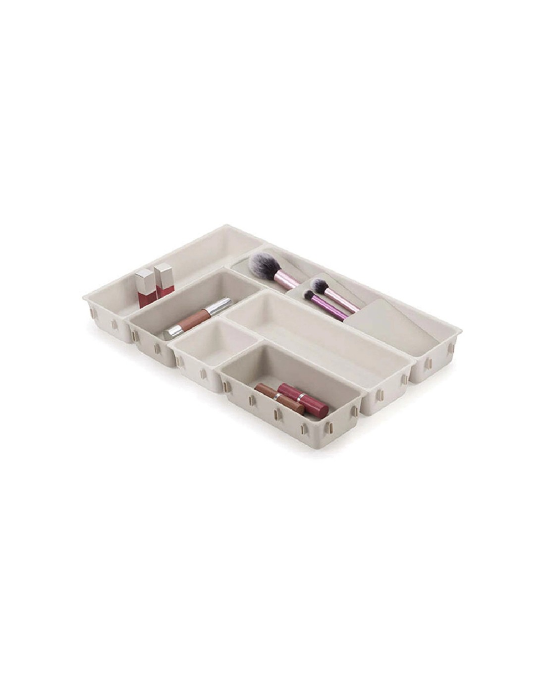 The set includes a variety of individual trays that can be clipped together on all sides, allowing you to customise the arrangement to fit your drawer perfectly. It features a tiered makeup brush holder for easy access to your brushes and self-adhesive, non-slip feet to ensure stability once your configuration is complete. The durable polypropylene construction makes cleaning simple with a wipe of a damp cloth.