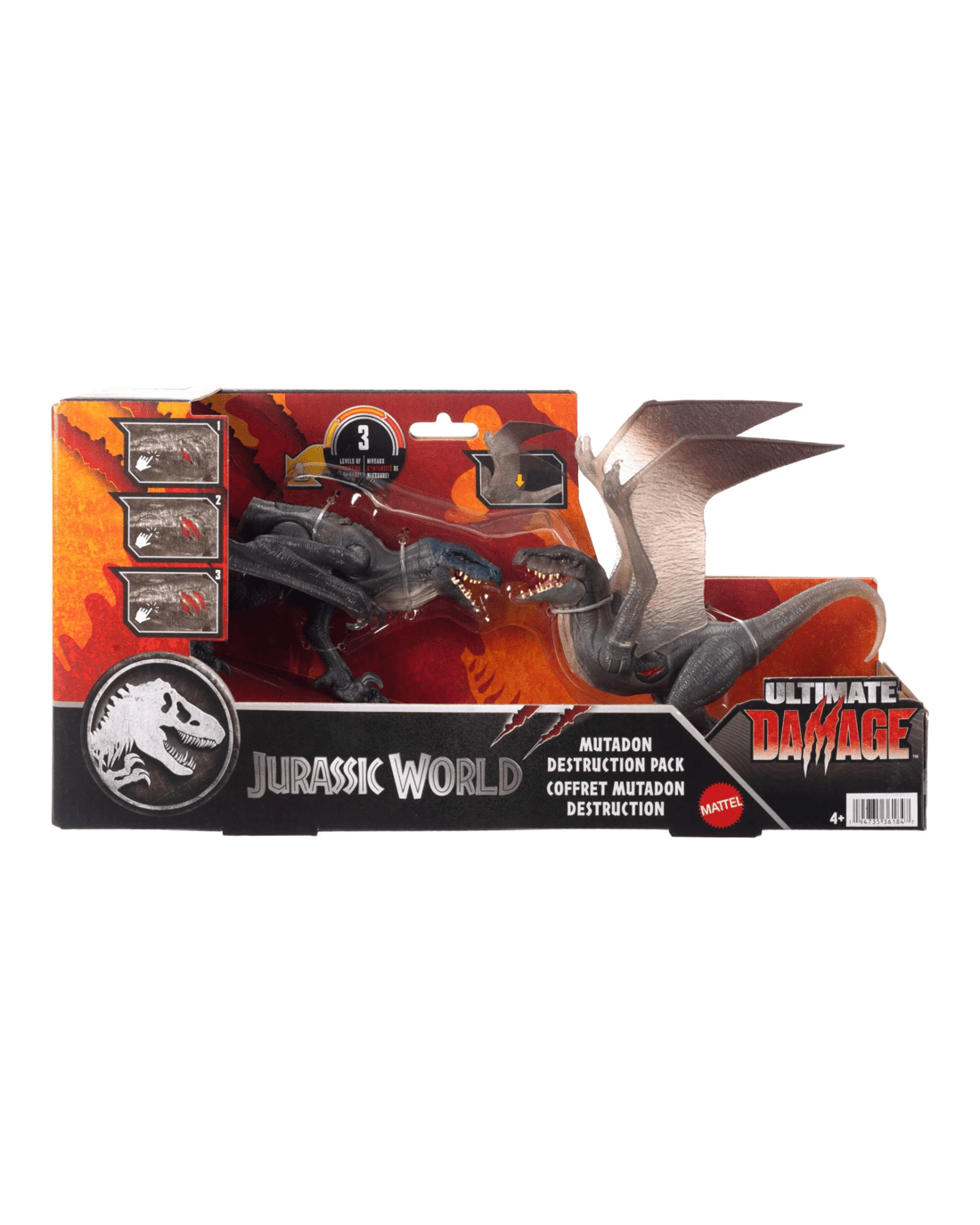 - Dinosaur Destruction! There are two ferocious Jurassic World Rebirth dinosaur figures in the Mutadon Destruction Pack one with dramatic wing flap action and another with 3 levels of intensifying damage!
