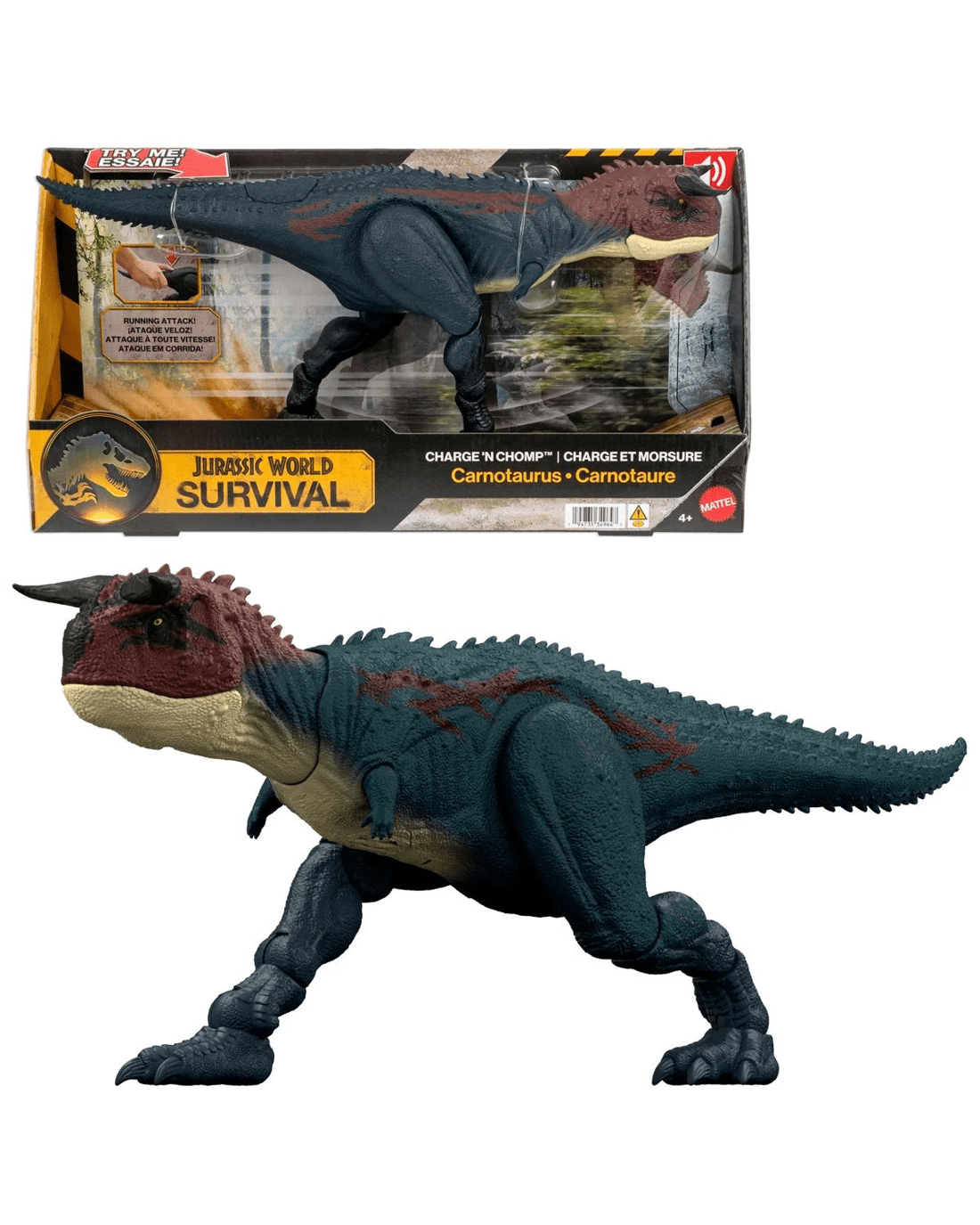 The Jurassic World Charge 'N Chomp Carnotaurus dinosaur toy has a thrilling running and chomping motion as well as roar sounds. The multi-jointed legs move in a realistic charging run, activated by a button at the base of the tail. The running pounce sets it on offense and the chomps provide defence. This multi-featured dinosaur toy is ready for battling fun. Scan the Tracking Code on the dinosaur's foot in the free Jurassic World Play App with a compatible smart device (Android or iOS, not included) to unlock a digital version of the dinosaur and play the fiercely fun game to race vehicles on land, air and sea. Suitable for dinosaur fans ages 4 years and up.