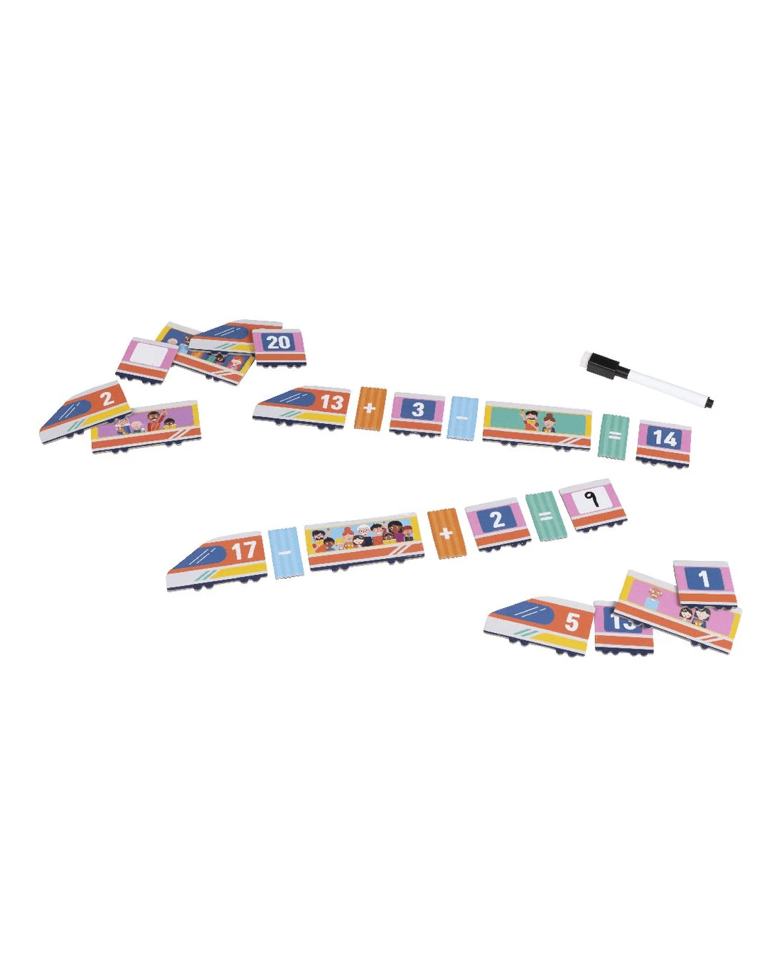 - This set includes: 20 x front train pieces, 20 x number carriage pieces, 4 x blank carriage pieces, 20 x illustrated carriage pieces, 6 x math symbol pieces and 1 x wipe-clean marker