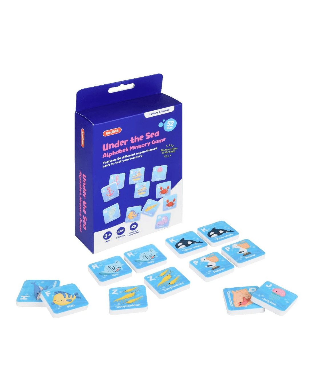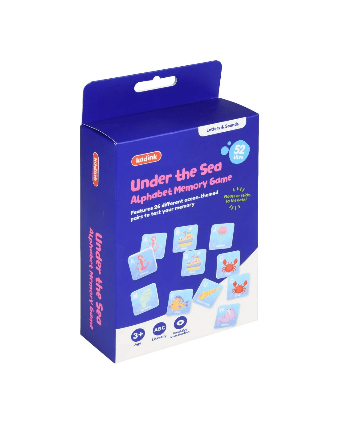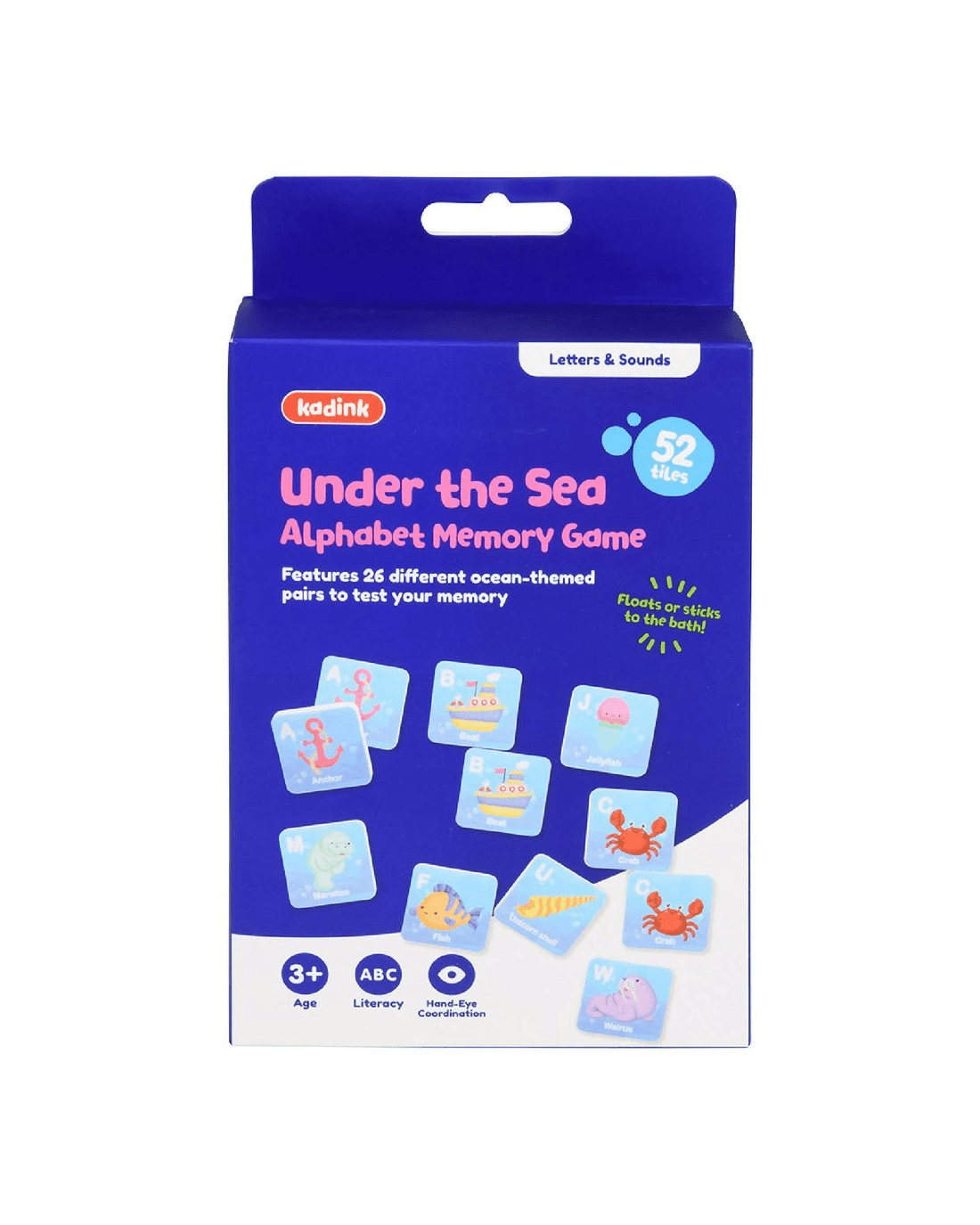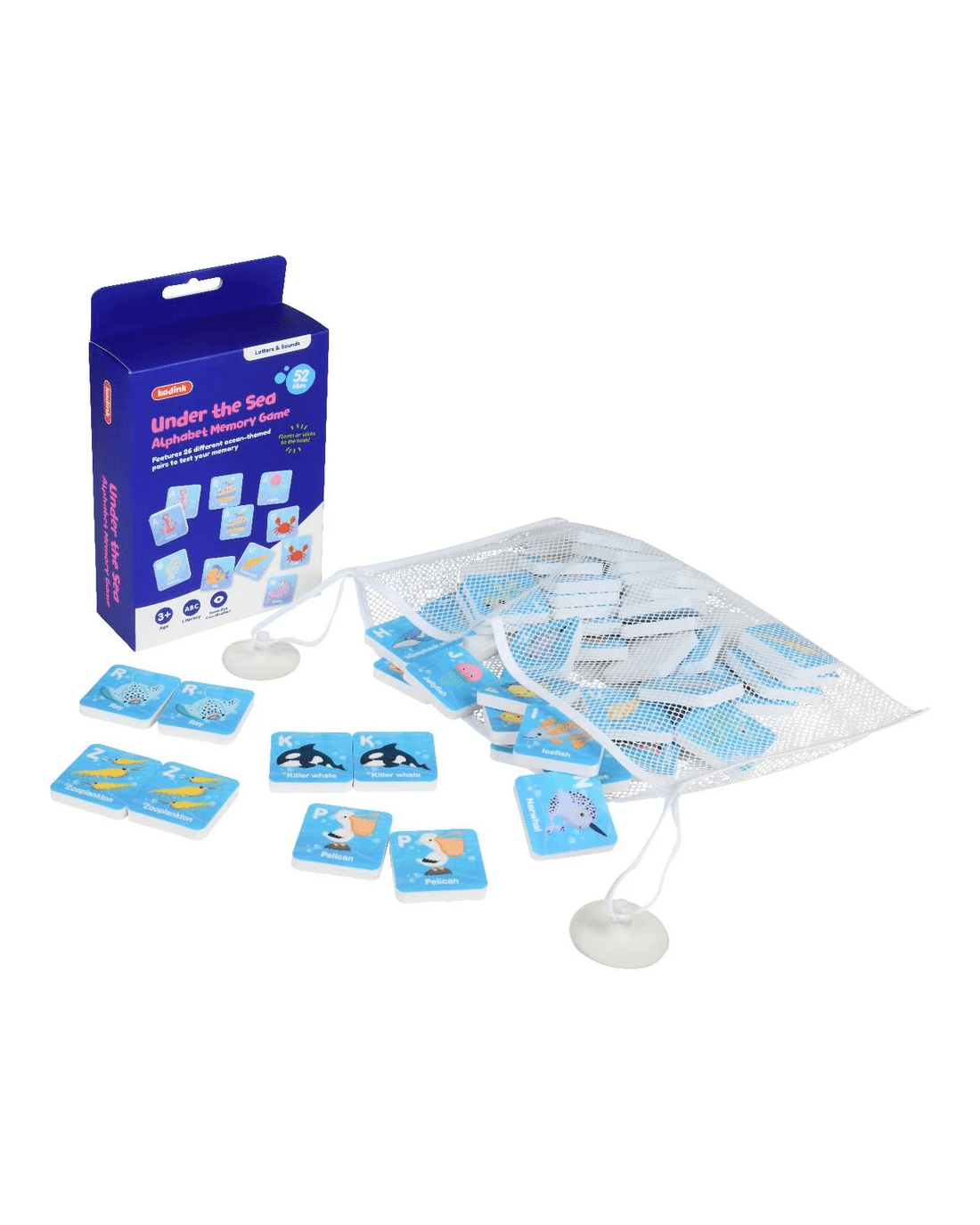 Help little ones develop early recognition and literacy skills with this fun Bath Time Memory Game from Kadink. This set includes 26 pairs (52 total tiles) that float in water and stick to most bathroom surfaces. Float them face down and stick them to the side of the tub after you find a match, then pack them away in the handy mesh bag for next time.