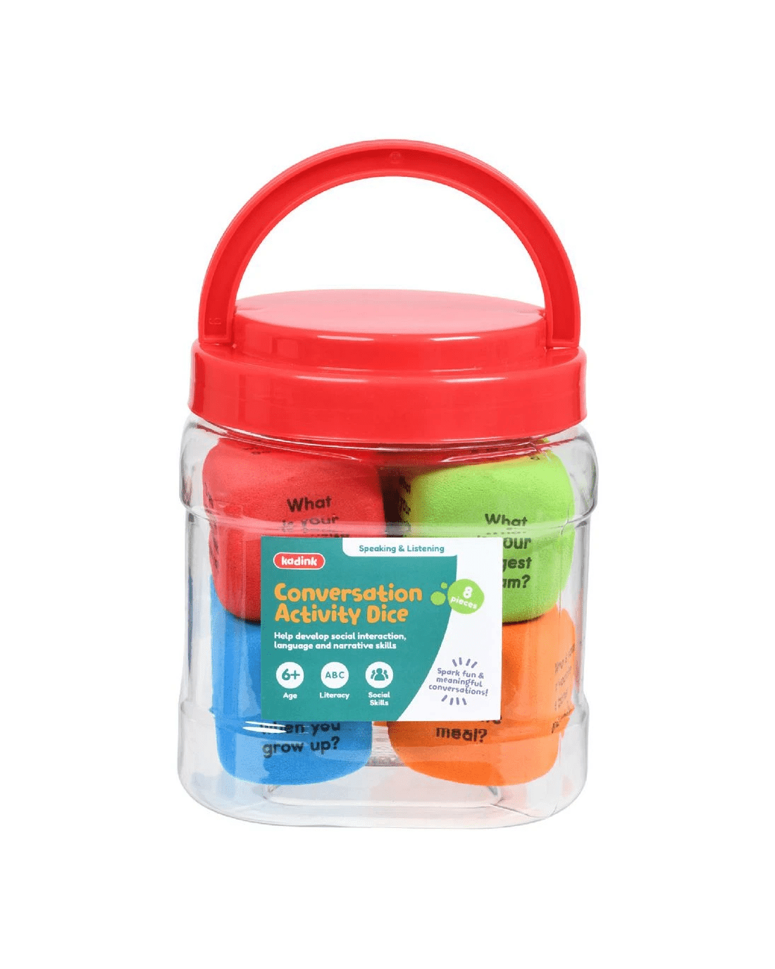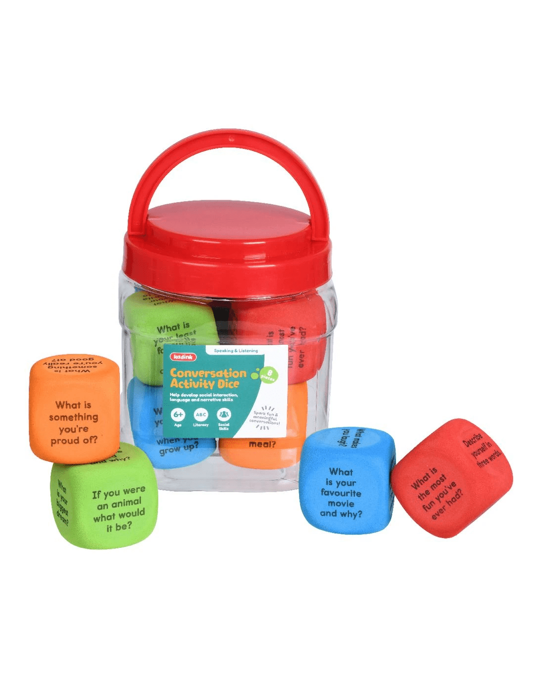 Learn about all the different ways you can socialise with this Kadink Conversation Activity Dice Jar. It's great tool for getting to know new people and inspiring meaningful conversations. This pack comes with 8 assorted conversation activity die and a reusable storage jar that makes tidying up a breeze.