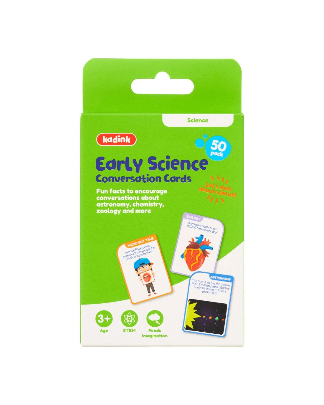 These Kadink Conversation Cards will help early learners build their language skills and knowledge on the topic of early science. Each of the 50 cards in the pack are double-sided with prompts that will jump start conversations on science facts about space, DNA, animals, plants and more.
