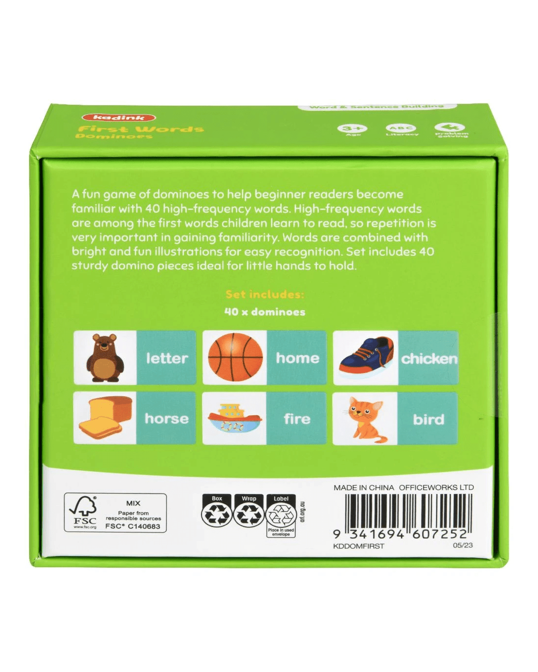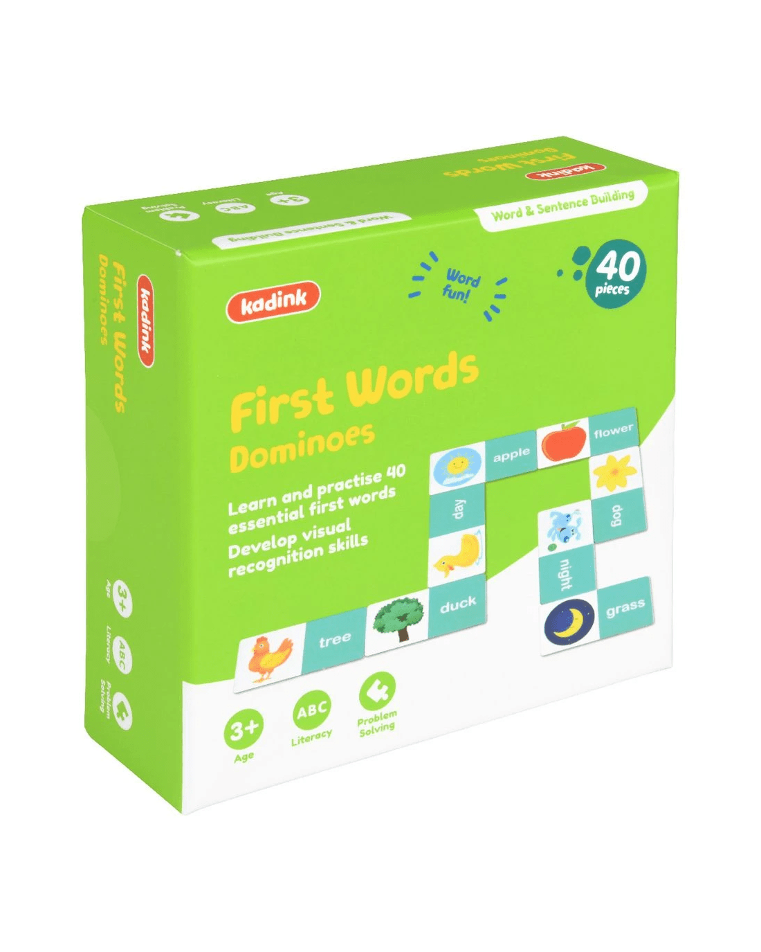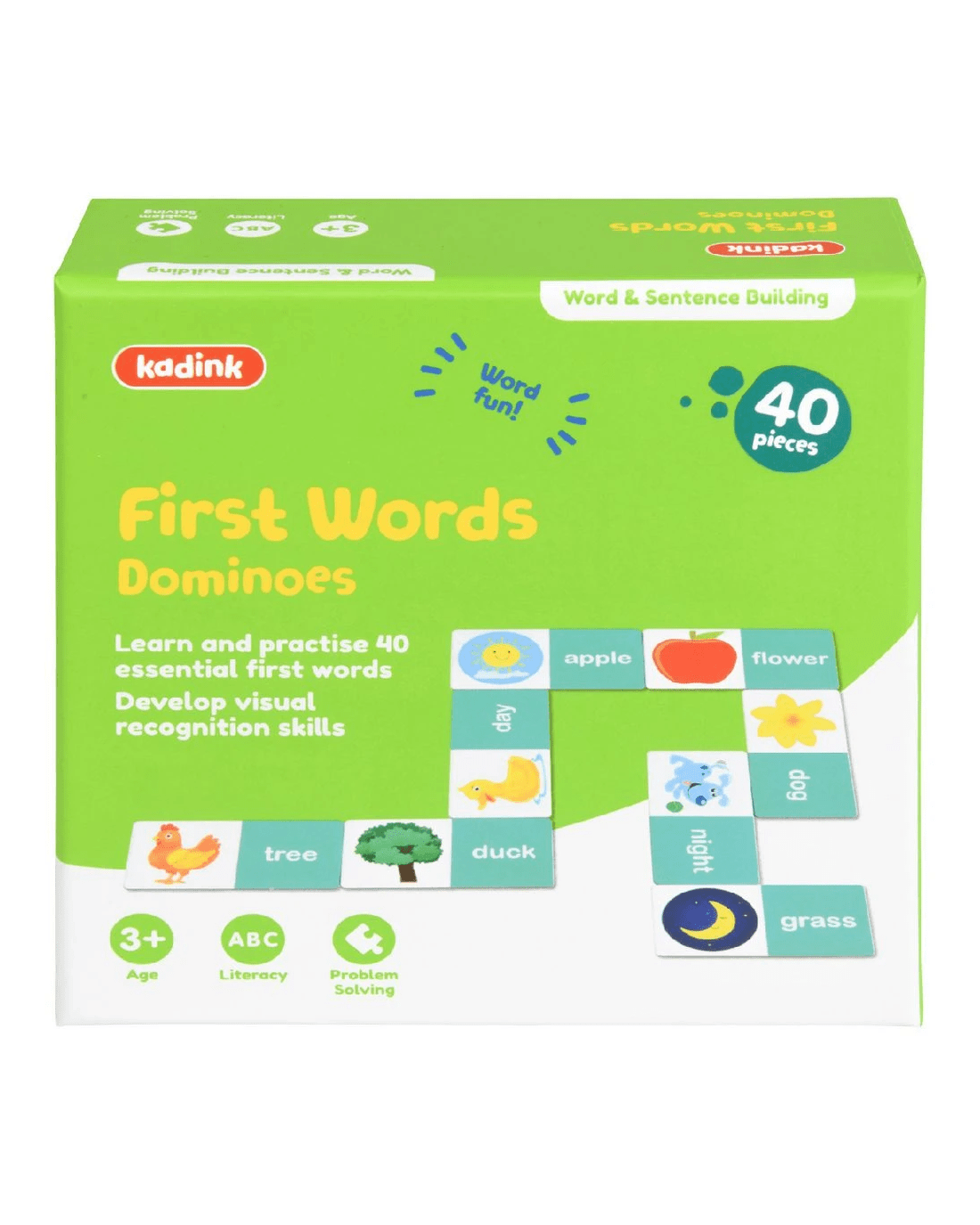 These Kadink Dominoes are a practical and fun way of teaching young readers common sight words. They have been designed to help pre- and primary-schoolers build their literacy skills. A combination of sight words and simple phonetic words are included, with clear illustrations to provide valuable picture clues.
