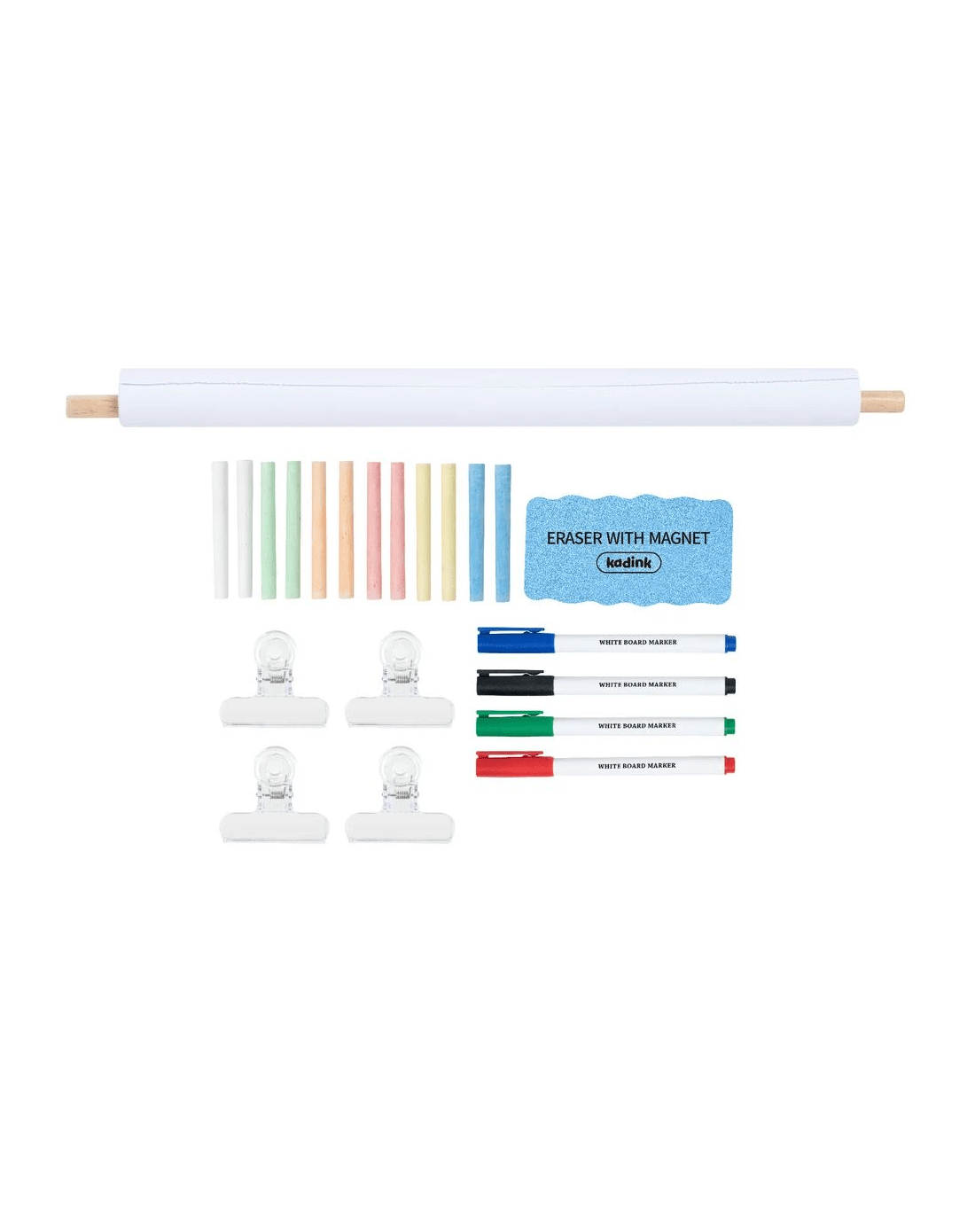 • It also comes with 4 clear clips, a box of coloured chalk, 4 markers, and 1 eraser.