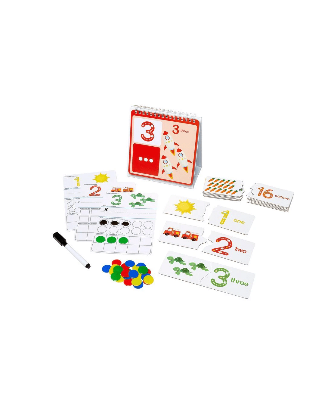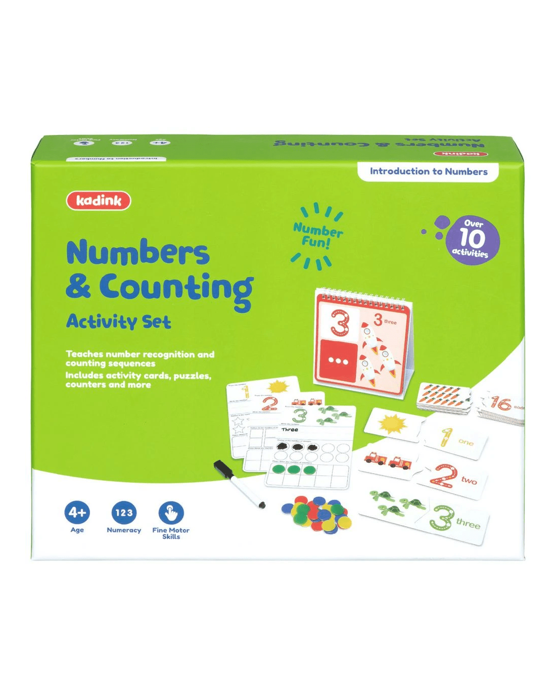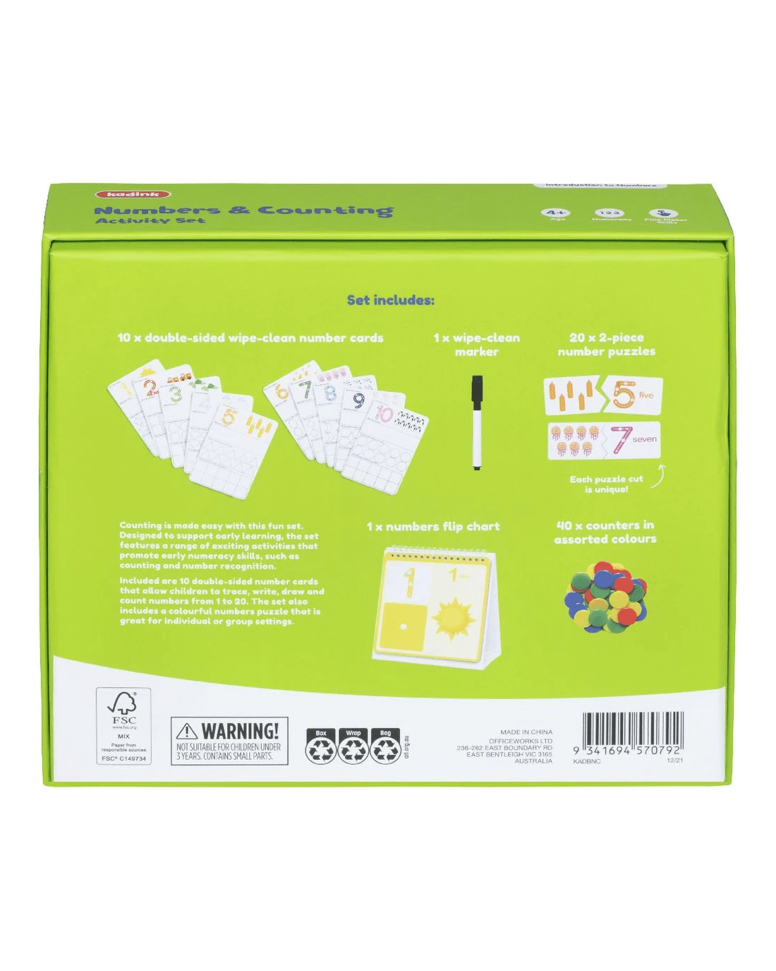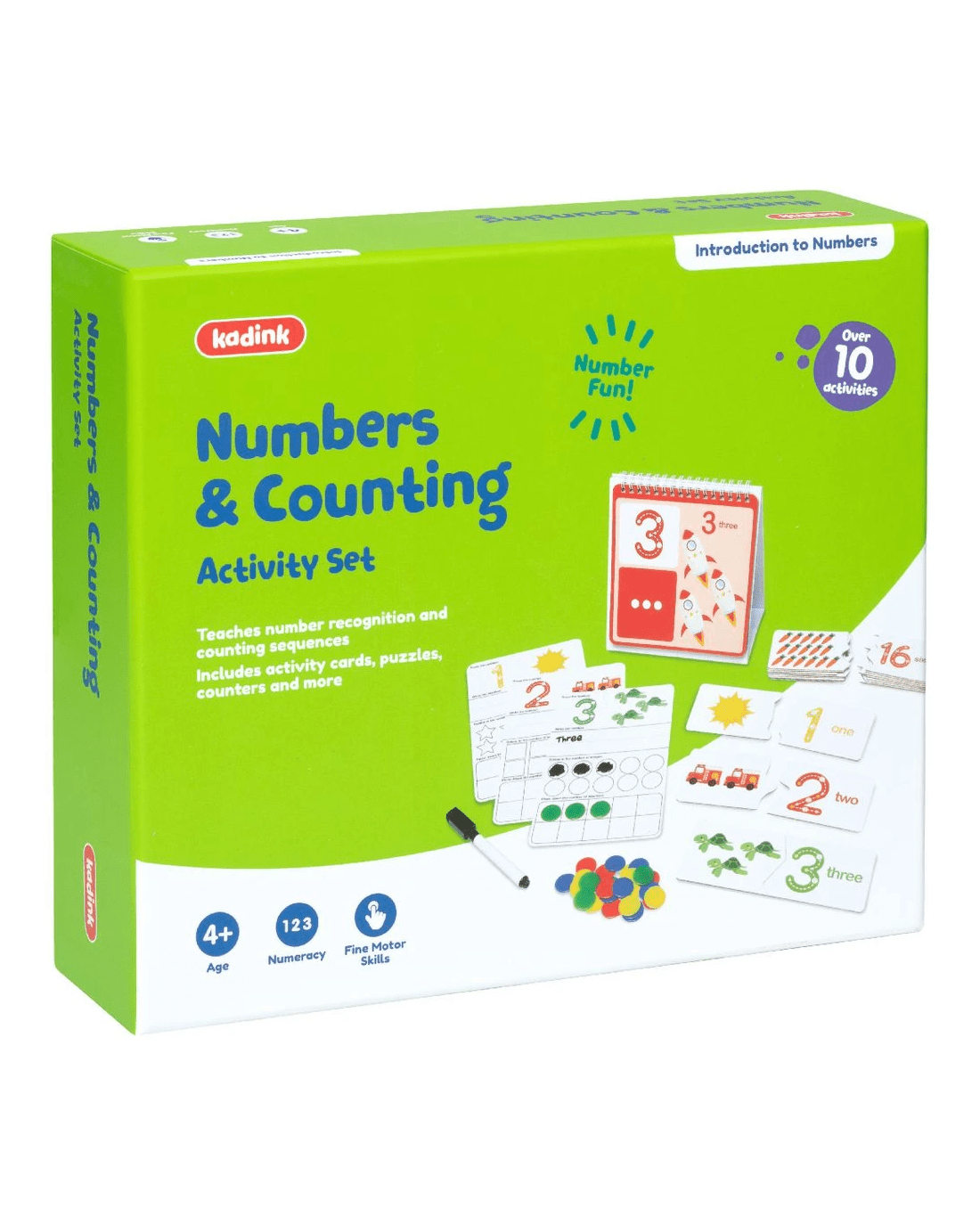 The Kadink Numbers and Counting Set includes various resources to help develop numeracy skills and number recognition. You can pactice writing numbers over and over again with the wipe-clean flip chart and number cards, use the counters to help early learners visualise the numbers and have fun matching the number to the correct picture cards with the number puzzle set.