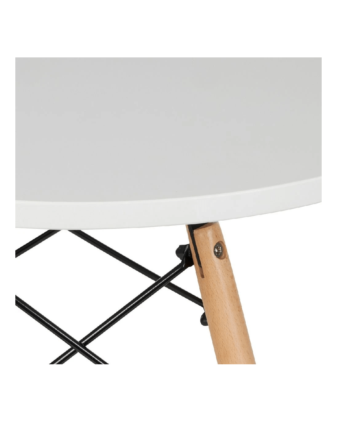 • It has a white surface with a powdercoated black frame and natural wood legs.
