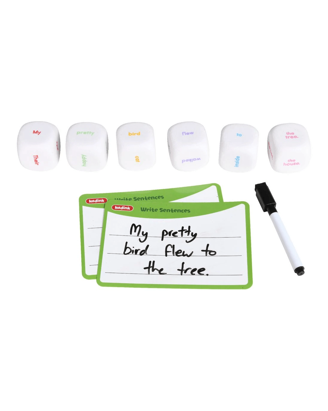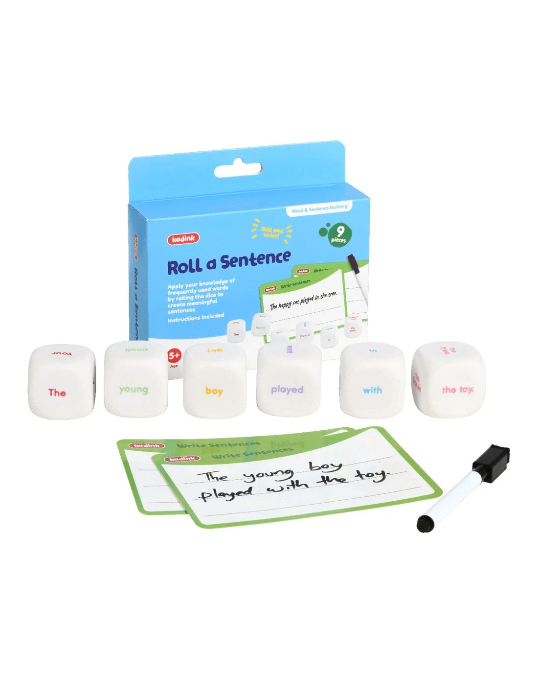 - This pack contains 6 sentence dice, 2 x A6 Write and Wipe cards, 1 dry erase marker and instructions.