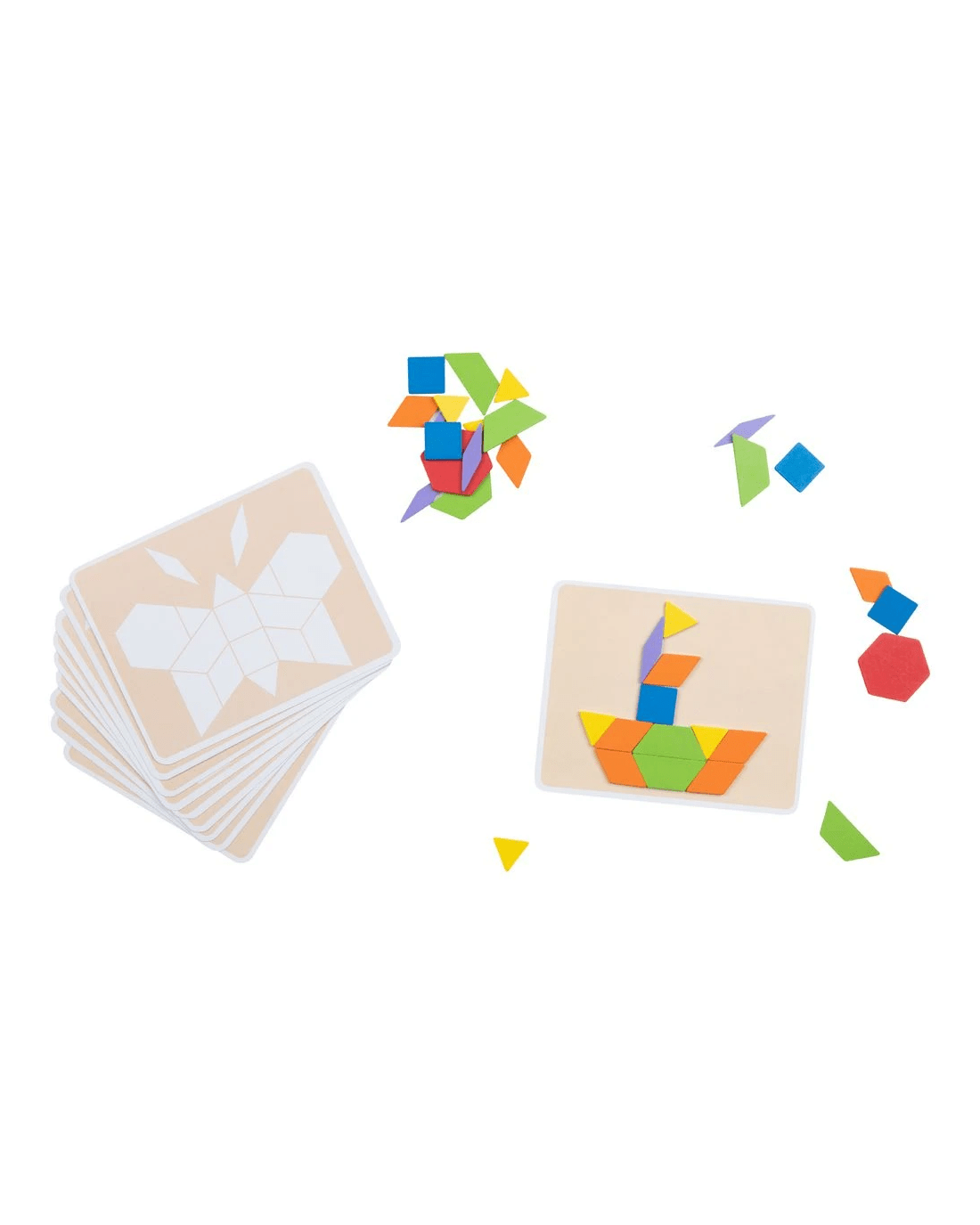 - This set includes 10 double-sided activity cards and 120 wooden shapes in assorted colours and shapes.