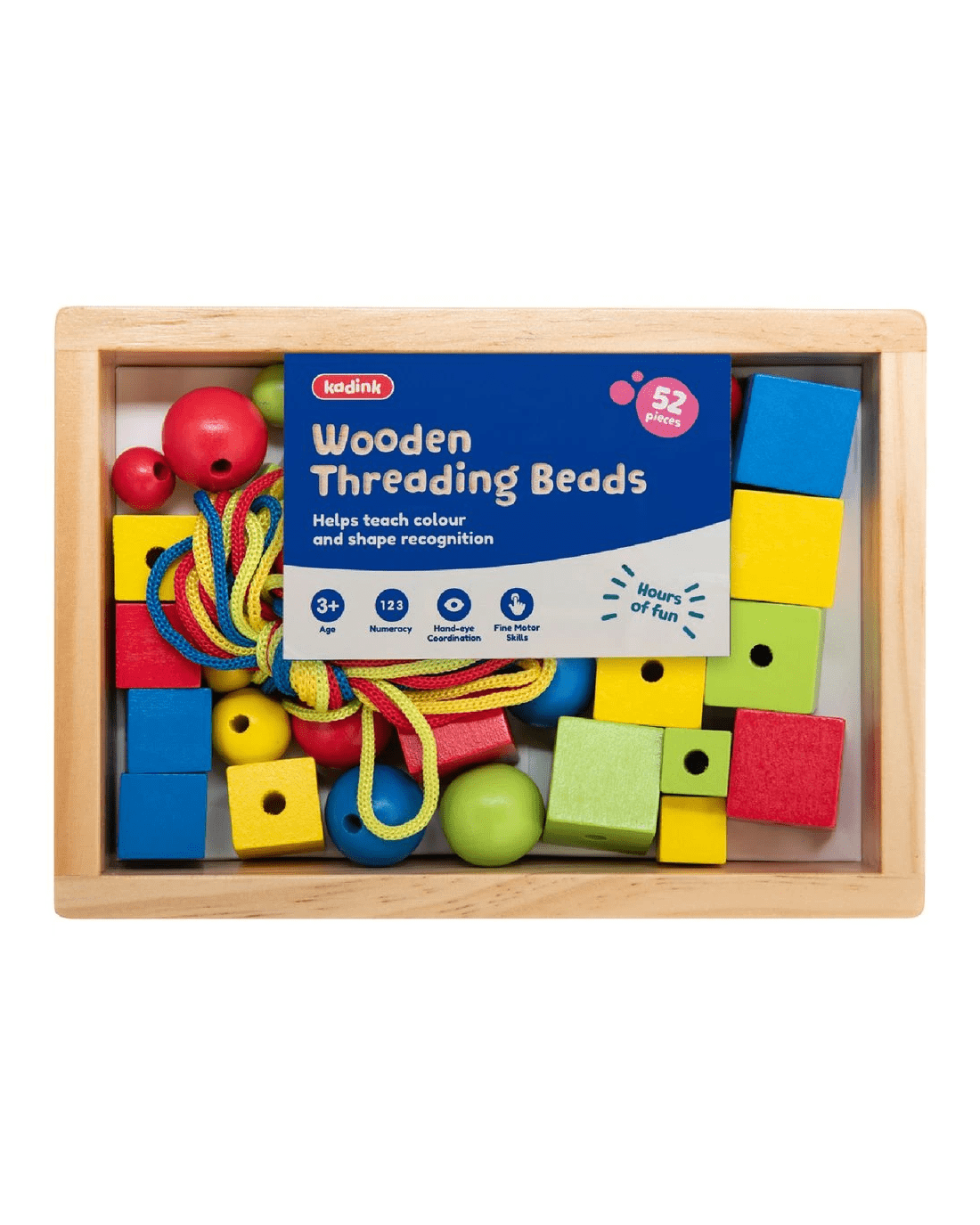 Ths Kadink Wooden Threading Beads activity is perfect for developing hand-eye coordination and fine motor skills in a playful way. It's non-toxic and suitable for ages 3 and over.
