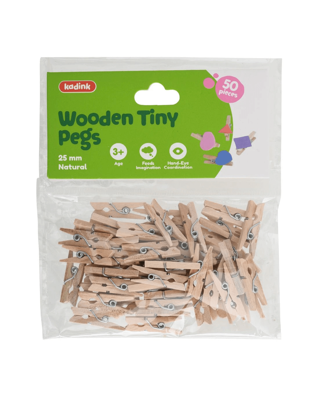 These Kadink Wooden Tiny Pegs are ideal for a variety of craft, art, and collage activities. There are 50 pegs in the pack in a natural wood colour.