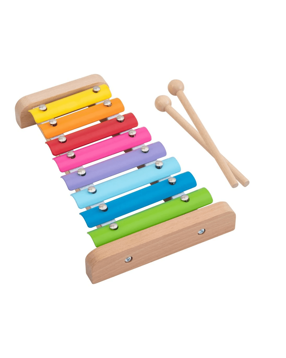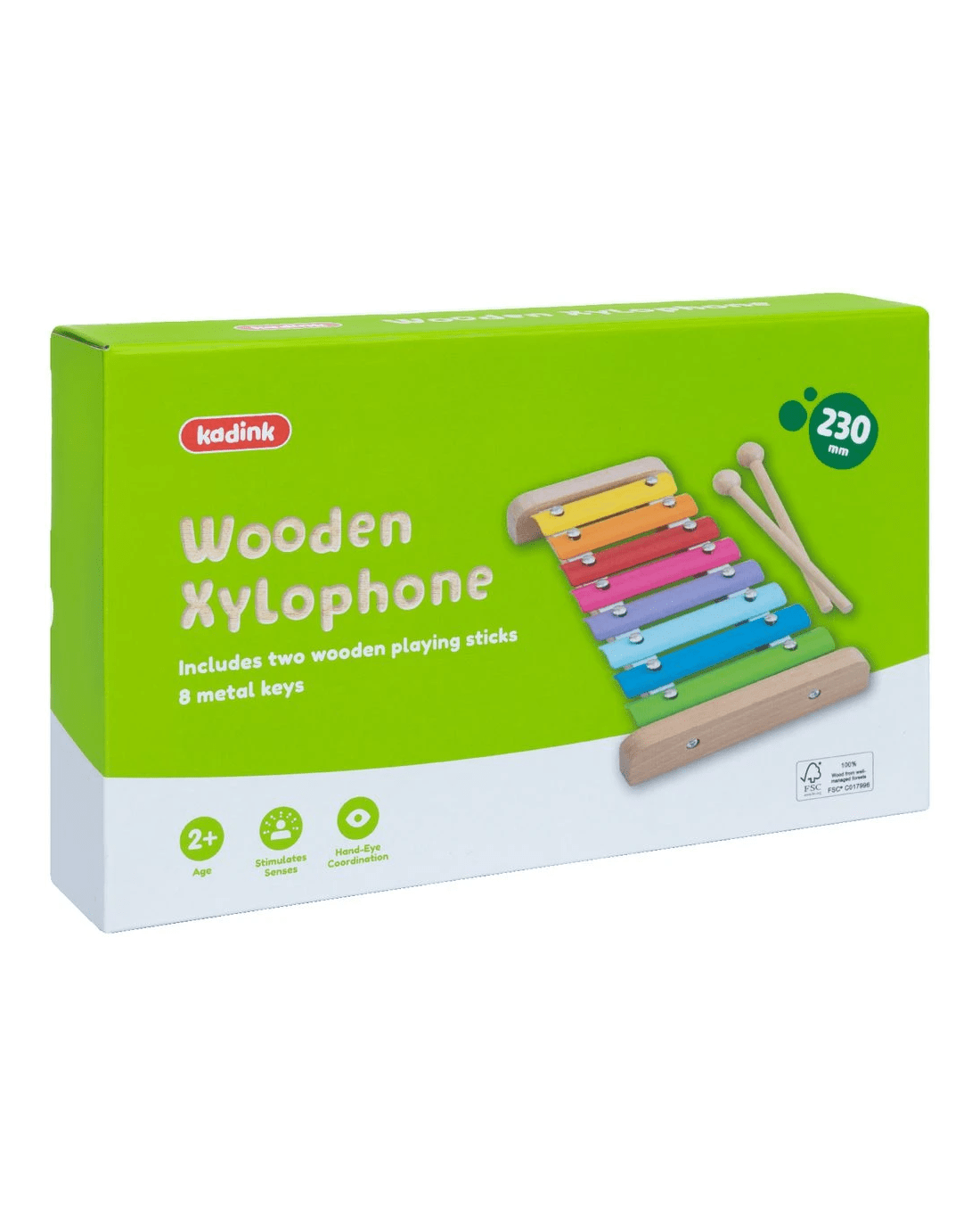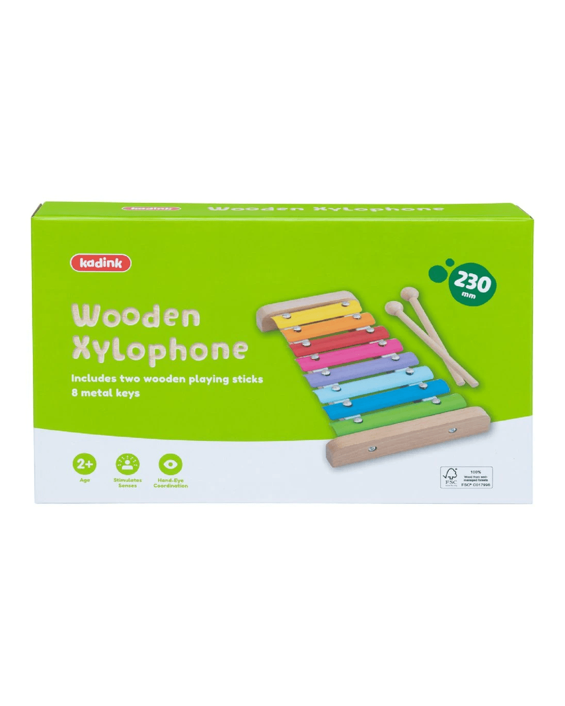 This Kadink Wooden Xylophone promotes the improvement of essential skils across coordination, creativity, and musicality. Each of the 8 metal keys produce unique tones when they're struck this the included wooden playing sticks. The bright colours and petite size makes it an exciting and easy-to-use educational toy for those aged 2 and over.