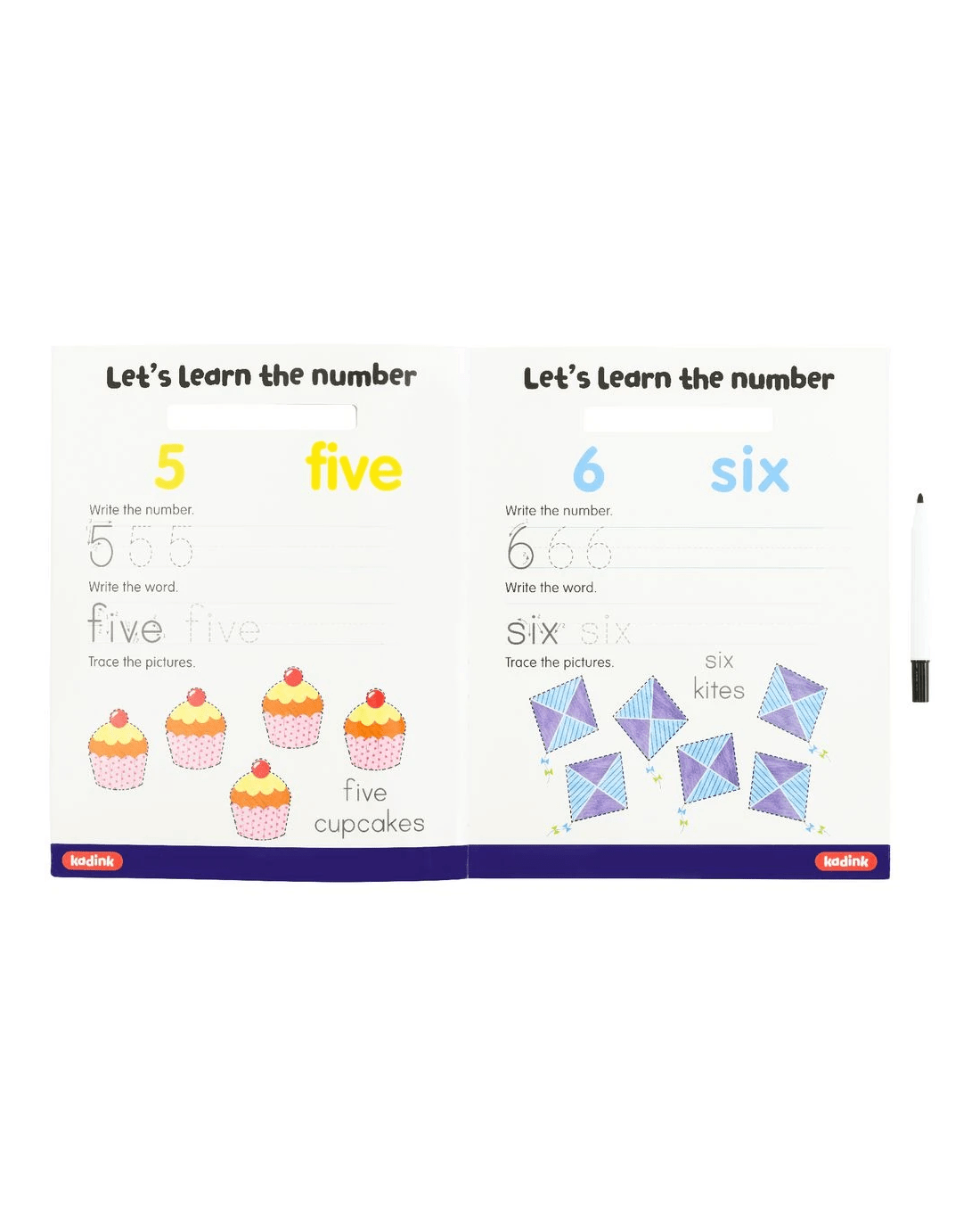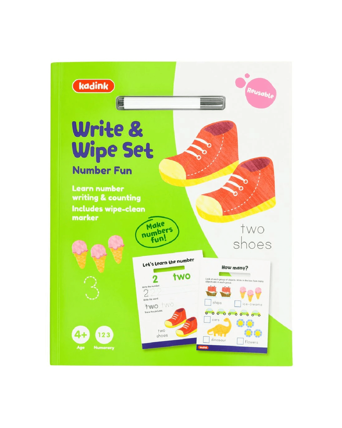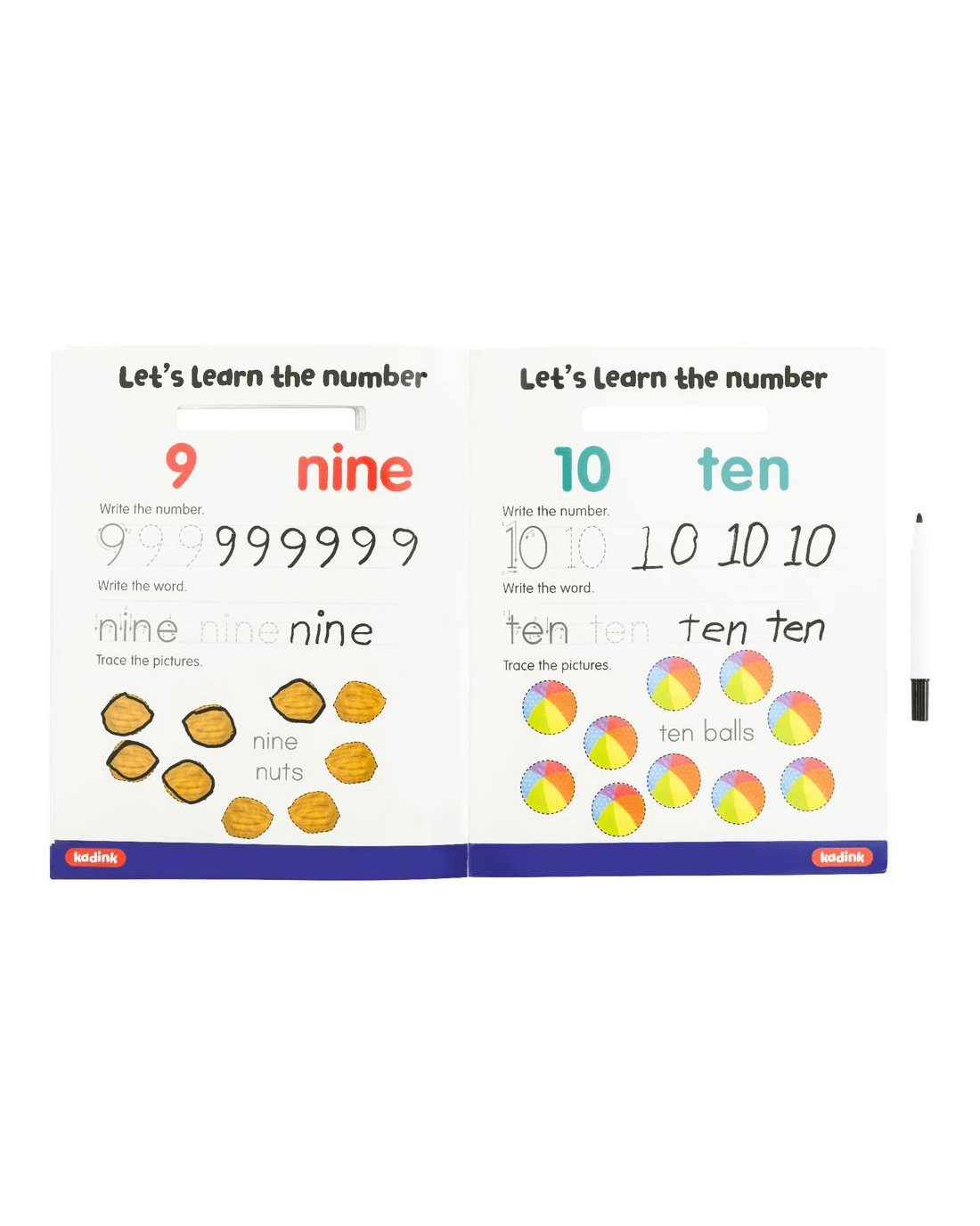This Kadink Write & Wipe Set is a 22-page educational workbook that comes with a wipe-clean marker. This book covers topics like number writing, counting to 10, and comparing quantities. It features bright illustrations throughout to make learning fun, as well as wipe clean pages so you can redo the activities as often as you'd like.