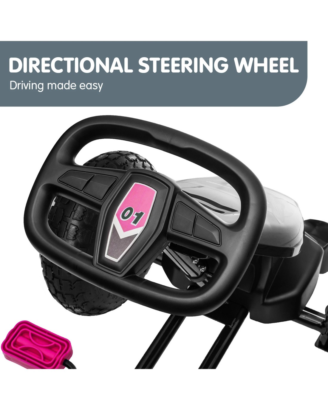 With treaded rubber tyres, a responsive brake system and a directional steering wheel, this go-kart is made with absolute safety in mind. It also has a push/pedal system to switch to manual pushing if needed. Whether your child likes to race or simply cruise the streets with friends, this bag of fun on four wheels will provide hours of go-karting fun!