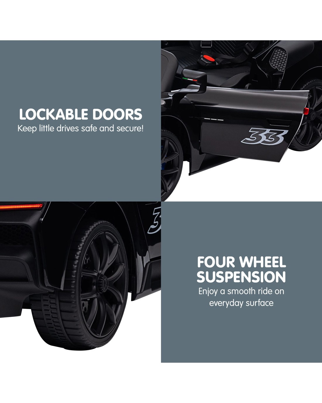 The interactive dashboard is packed with fun features like MP3, Bluetooth, USB, AUX, a mode switch and a power display for non-stop entertainment. Parents can easily take the wheel with the 2.4G remote, while kids get to enjoy smooth starts, forward and backward driving and adjustable speed settings. Its the perfect ride for your little racer!