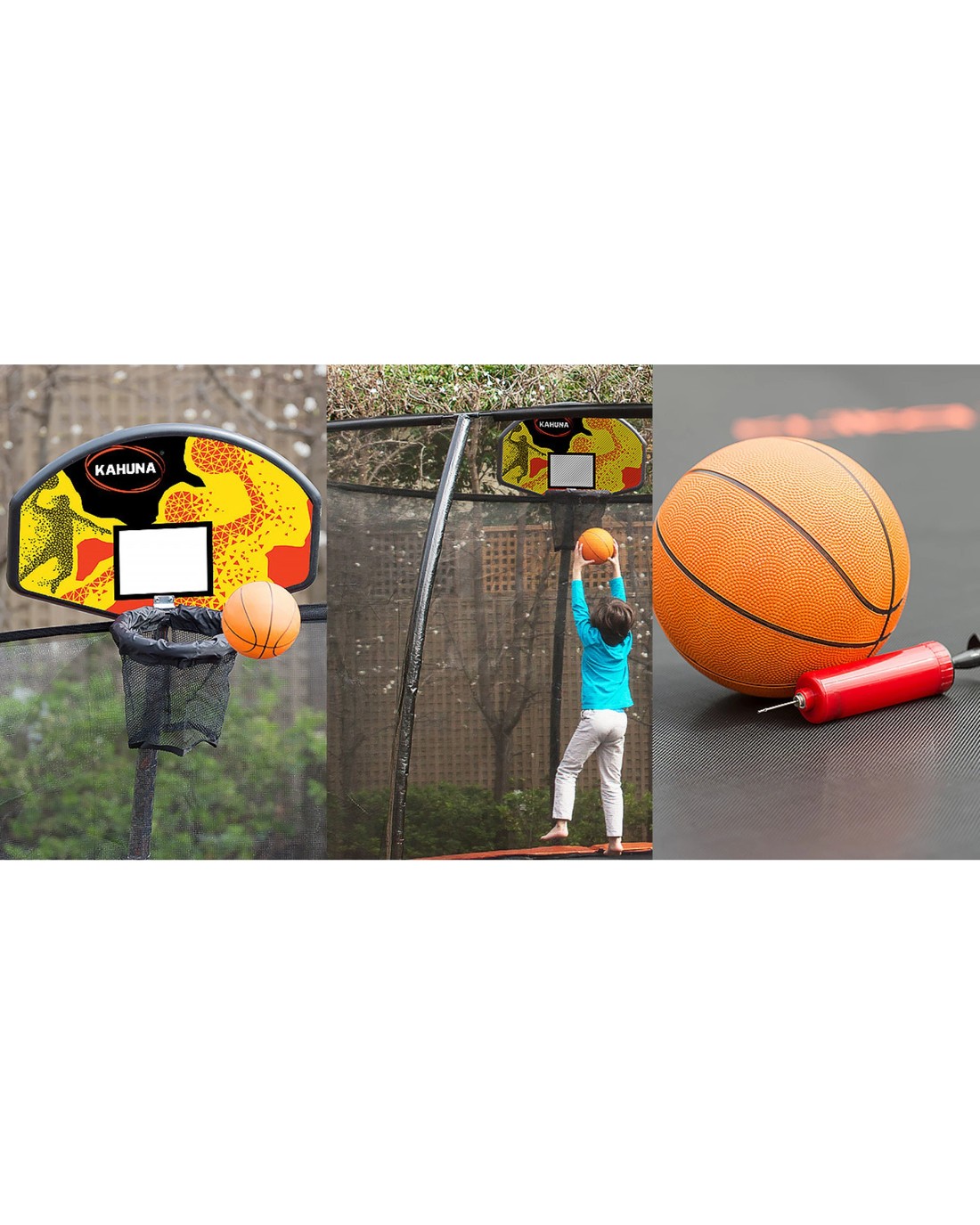 Basketball set! This trampoline is supplied with a basketball kit to add even more fun for the kids. This includes the backboard and ring, net, ball, and pump!
