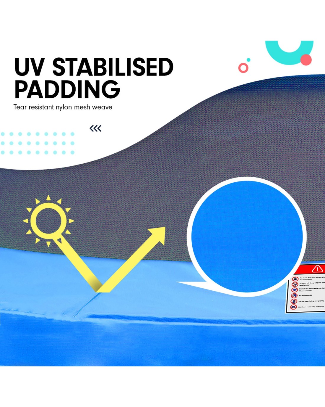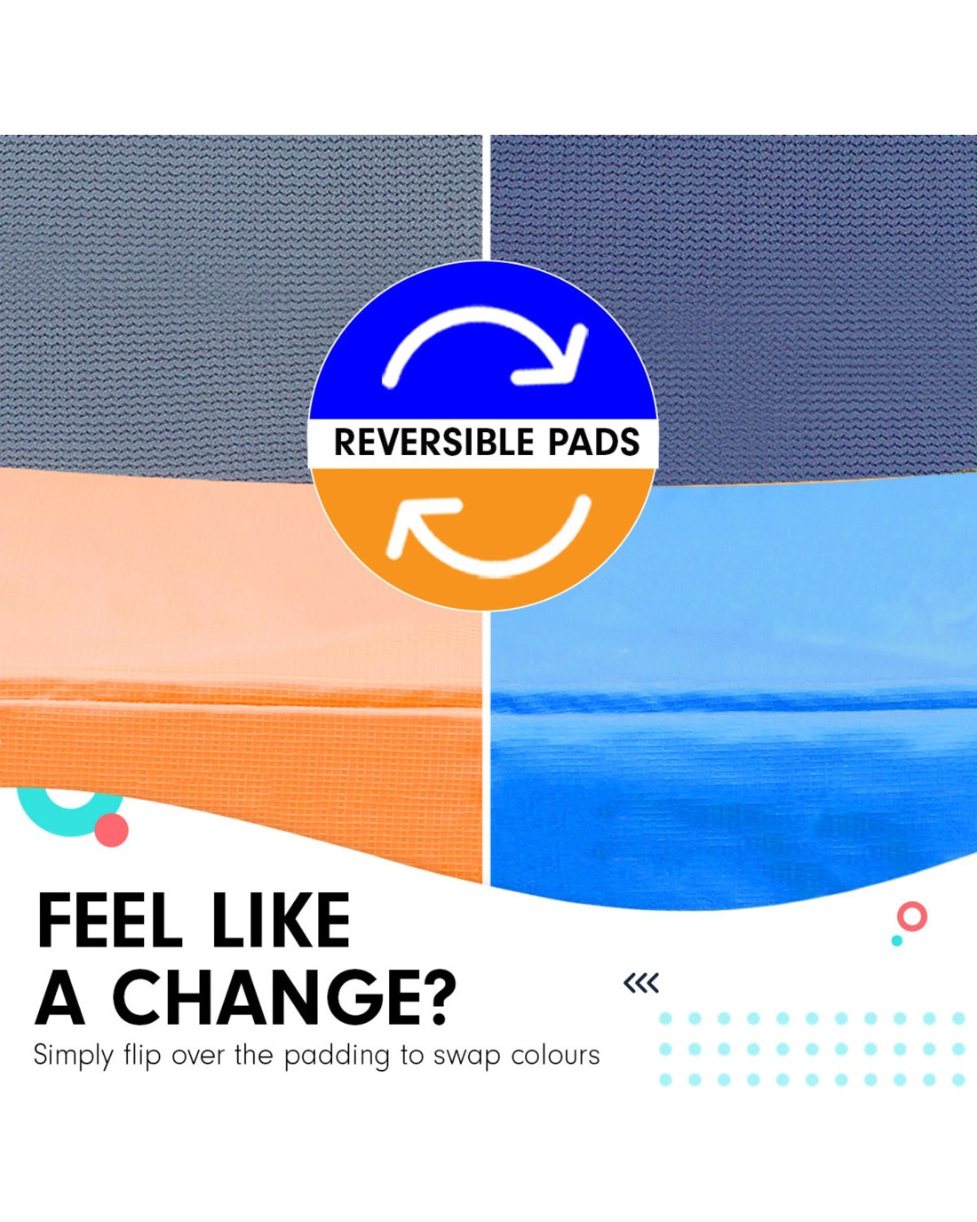 Genuine Reversible padding: This trampoline comes standard with reversible padding. Yes, this is a true reversible safety pad, not just a pit of blue sewn underneath. The quality of this padding is the best you will find in Australia! The padding cover is UV stabilised and has embedded nylon mesh, ensuring the padding will last under the harsh Australian sun.
