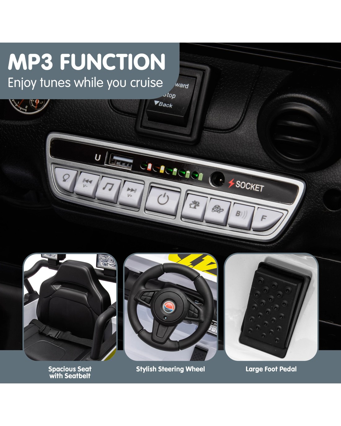 Embark on an adventure with the Kahuna S619 Gravity Ride On Car! This compact ride on is loaded with features including LED front lights, two colour-changing spotlights, a working horn and an upgraded dashboard capable of music and Bluetooth, delivering an authentic driving experience for your little speedster.