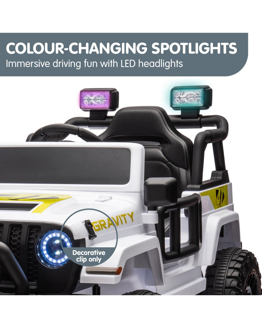 Please note that the fog lights, tail lights and bonnet clips are decorative only, while the spotlights require 2x AA batteries to operate.