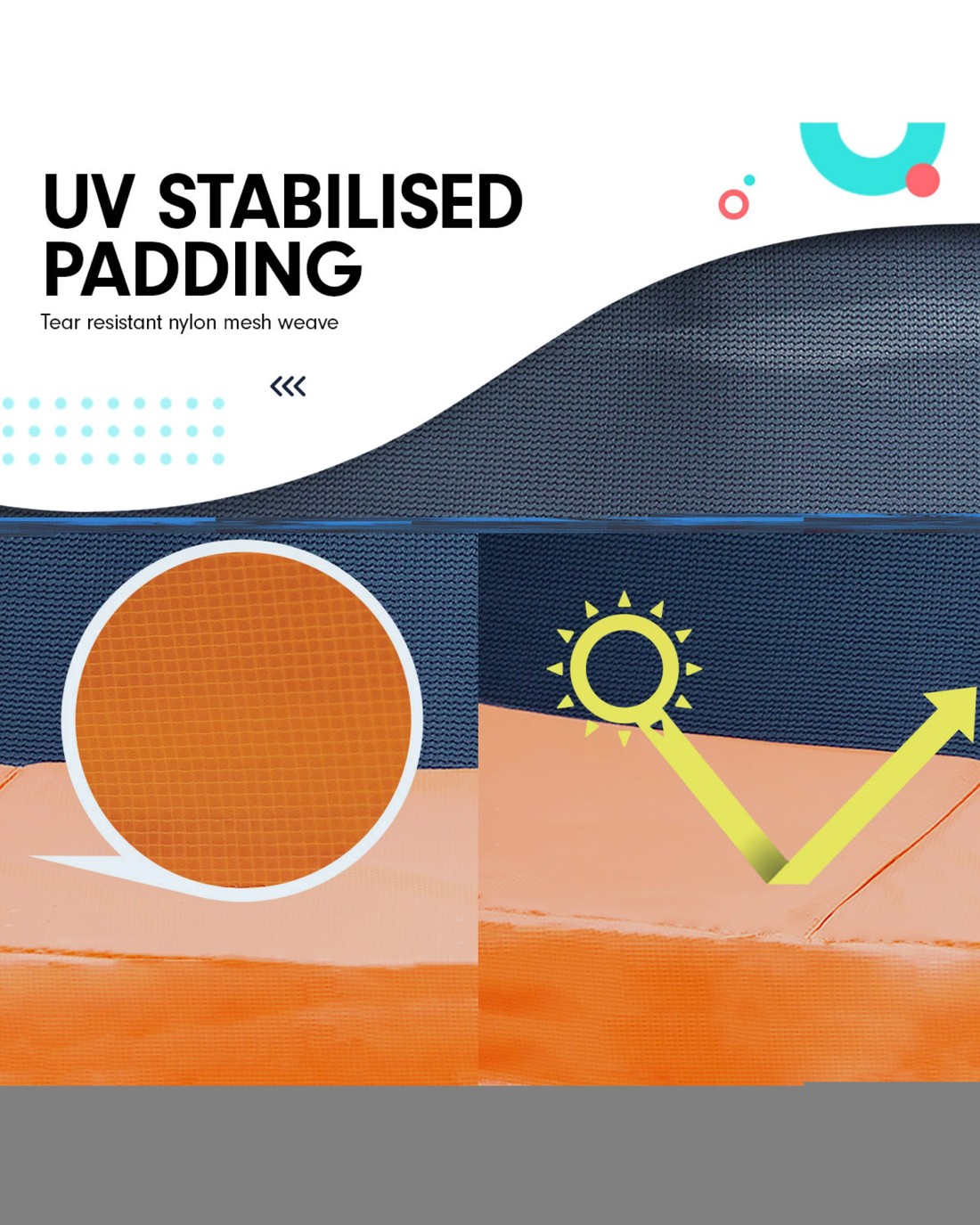 The padding cover of the trampoline is UV stabilised and has embedded nylon mesh, ensuring the padding will last under the harsh Australian sun.