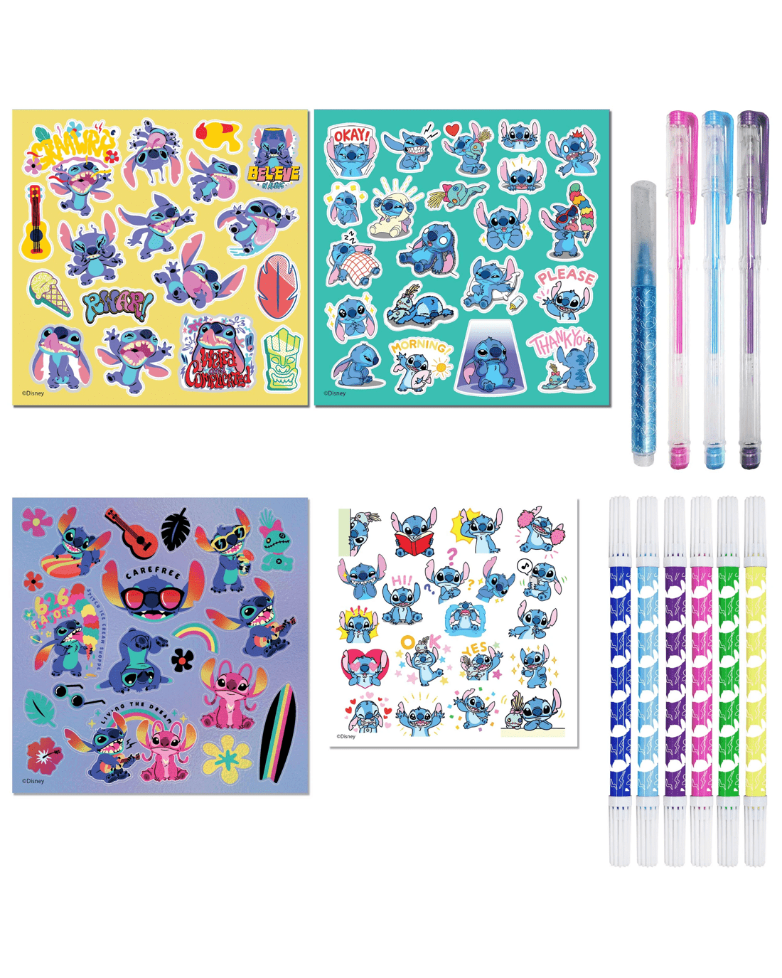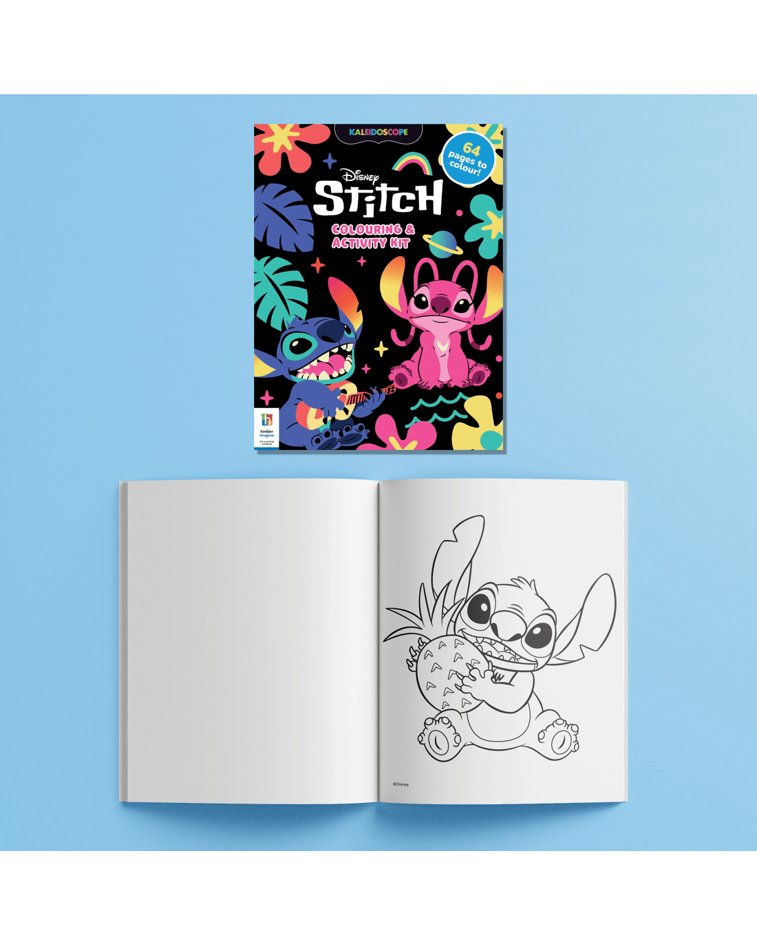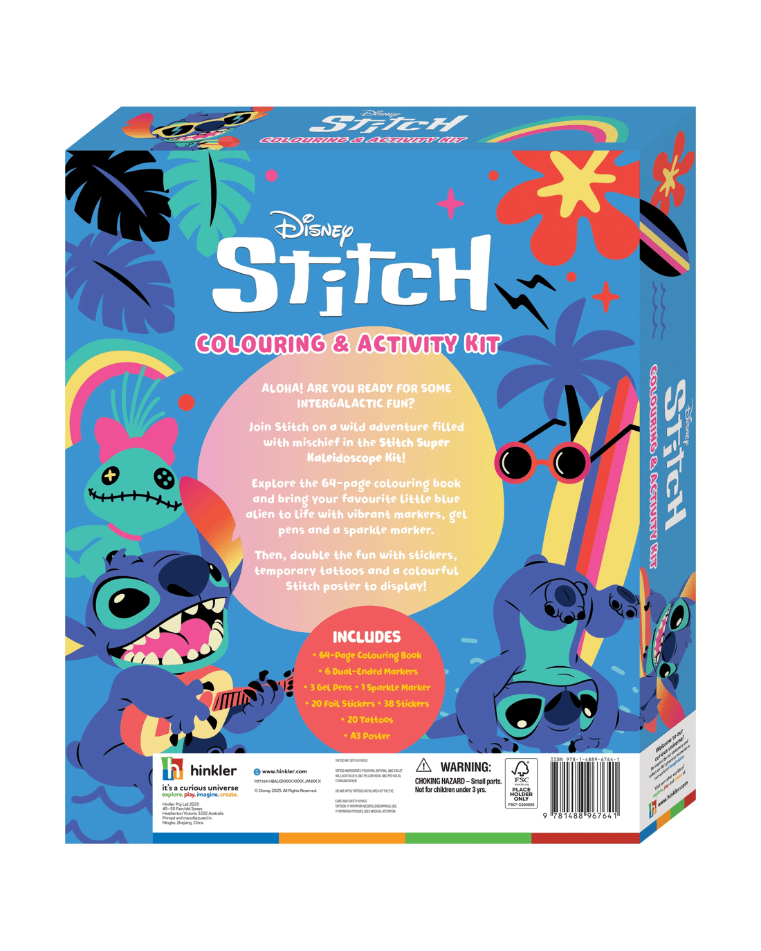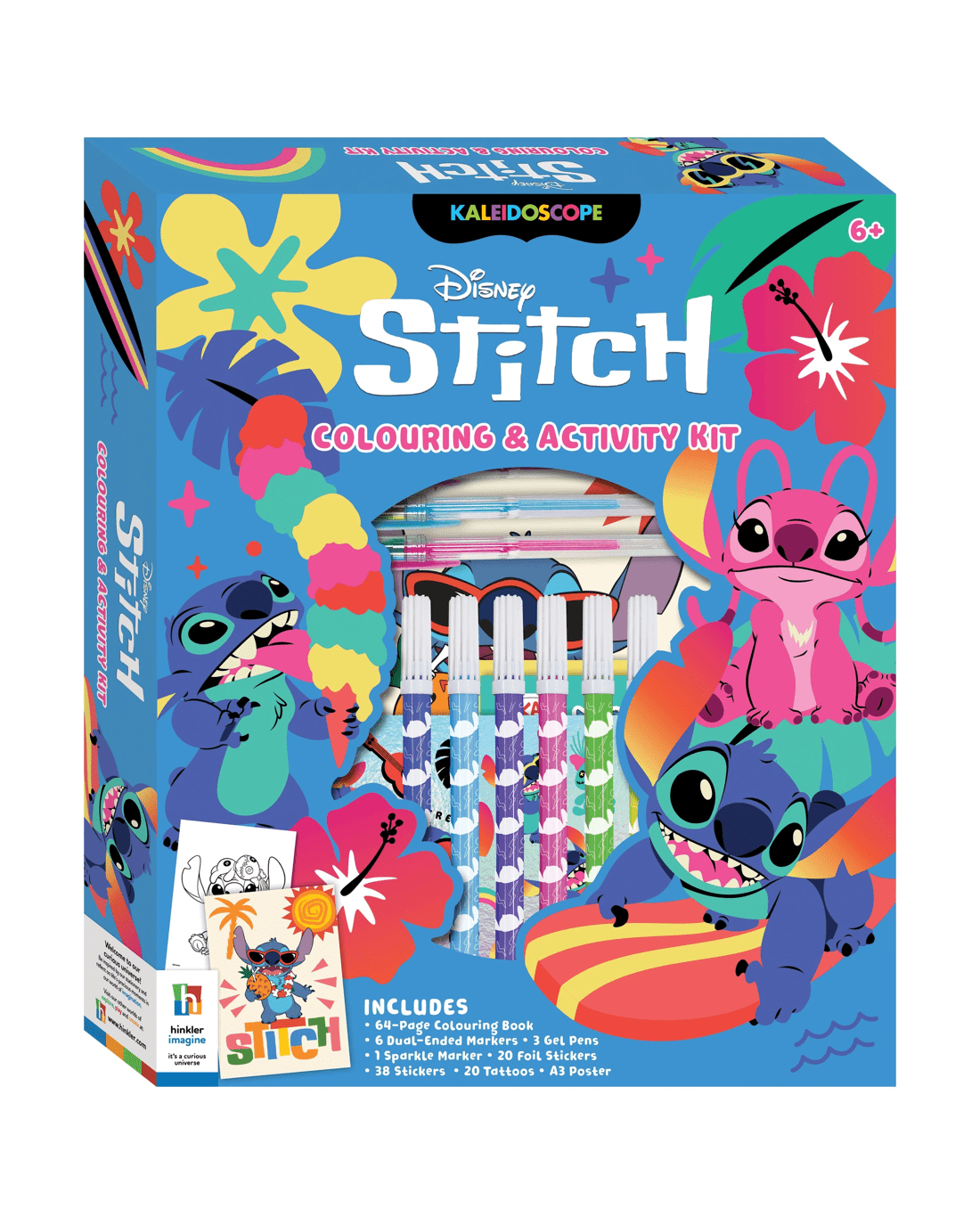 This kit contains heaps of fun things including a 64-page colouring book, six bold double-ended markers, a sparkly glitter marker as well as heaps of stickers, a tattoo sheet and an A3 coloured poster of Stitch having a blast!