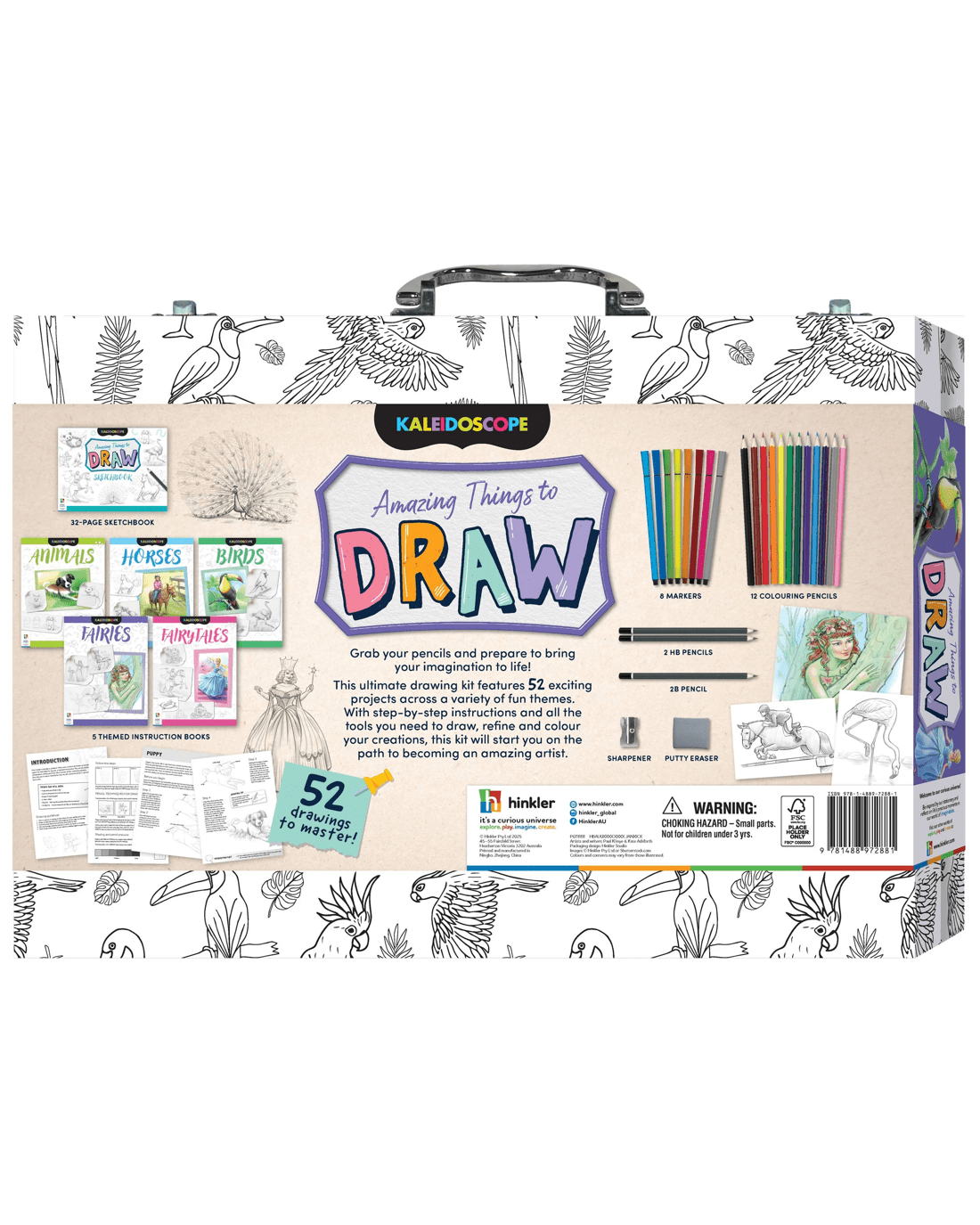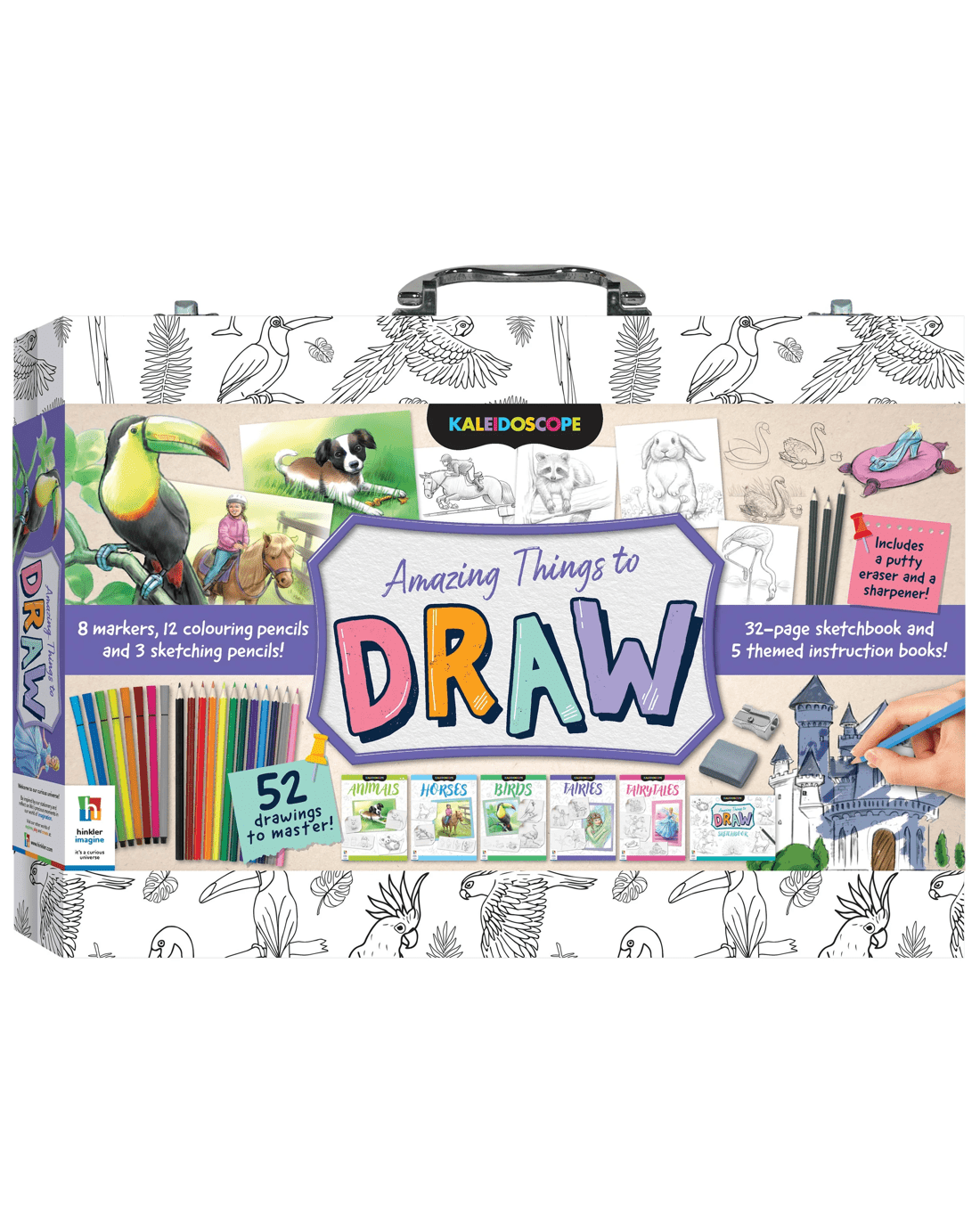 Grab your pencils and get ready for a drawing adventure with the Kaleidoscope Amazing Things to Draw Carry Case! This awesome set comes with five fun instruction books to help you master everything from fairies and princesses to cool animals and more. With heaps of colourful stationery, including pencils and markers, you'll have everything you need to bring your creations to life. Whether you're just starting out or a doodling pro, this carry case is packed with endless drawing fun!