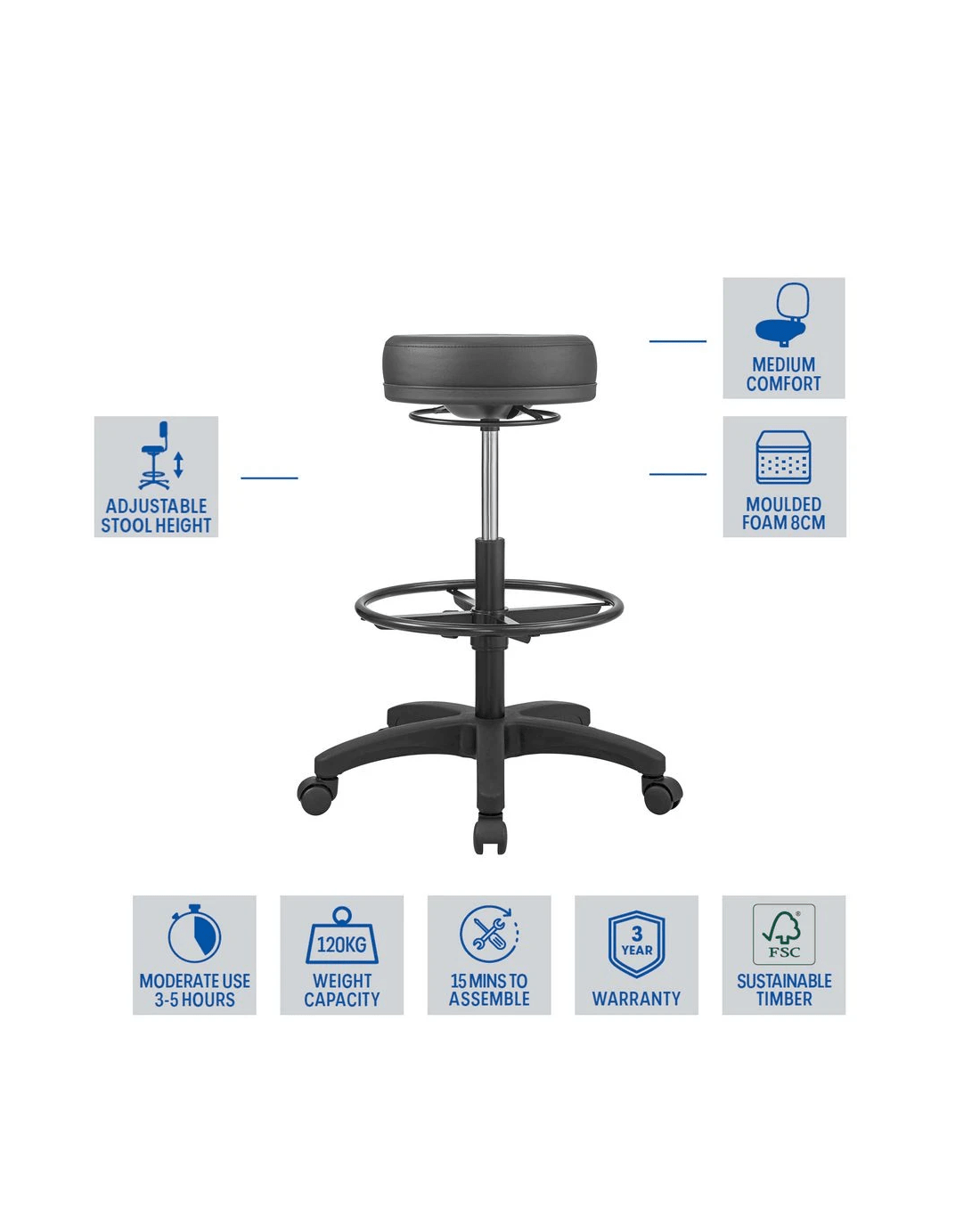 This Kasino Gas Lift Stool comes with 5 castor wheels which makes it easy to manoeuvre around for your convenience. It has gas lift functionality so you can alter the height and work at different levels during the day.