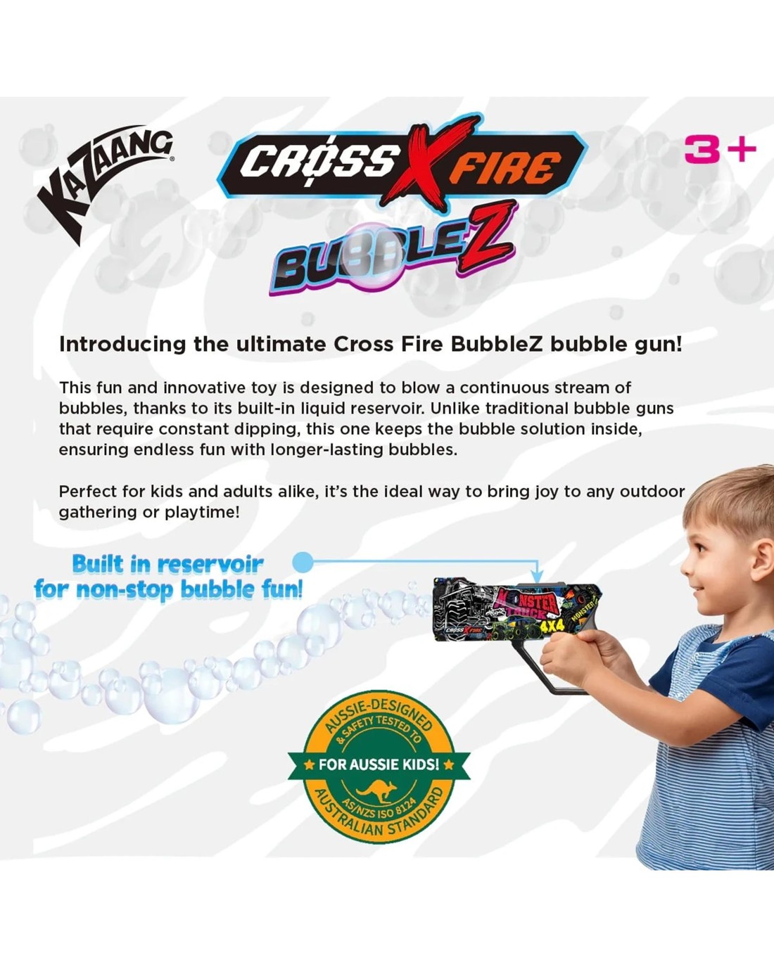 Unleash the Fun with Kazaang BubbleZ-Monster Truck Bubble Gun! Rev up your bubble fun with the Kazaang BubbleZ-Monster Truck Bubble Gun! This cool and exciting toy is perfect for kids of all ages, providing endless hours of sensory play and outdoor entertainment. Designed with lit graphics and a monster truck theme, it's a showstopper at any playdate or party. Make every playtime an adventure with the Kazaang BubbleZ-Monster Truck Bubble Gun. Whether it's a sunny day in the park or a birthday party in the backyard, this bubble gun is guaranteed to bring smiles and laughter. Grab yours today and let the bubble fun begin! Ages 3 +