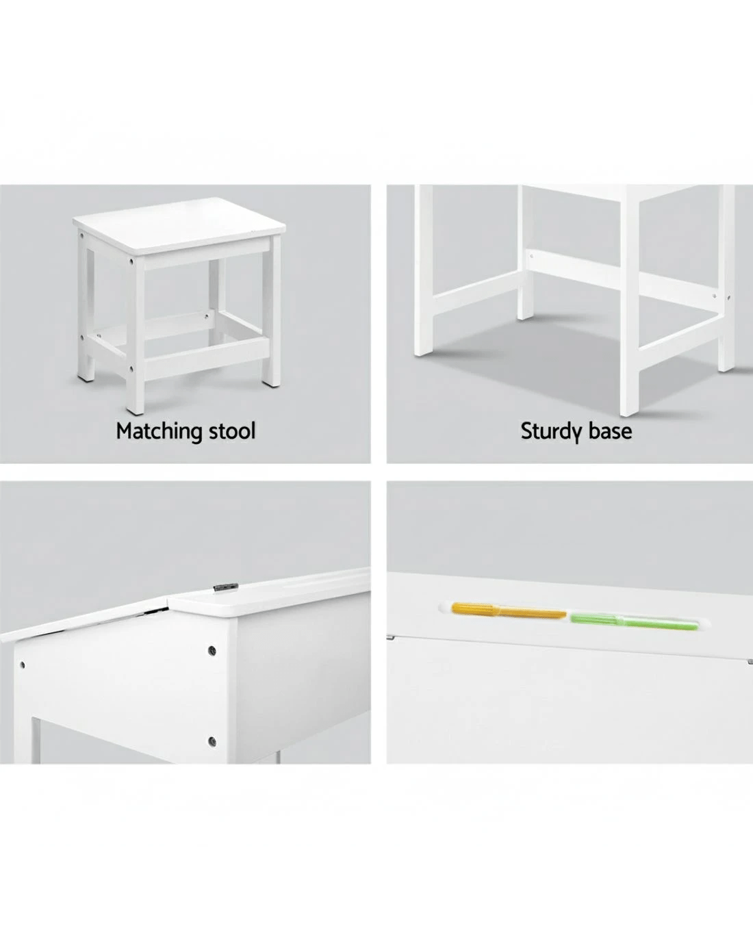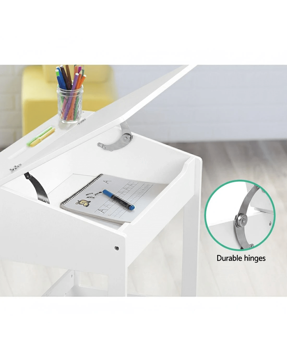 One of its most prominent features, the inclined desk top allows for easier use when writing or reading without putting excessive strain on the child's back. A matching stool ensures that it works perfectly in tandem with the desk. Other great features include a groove for stationery and a hidden storage compartment when the desk top is lifted up.