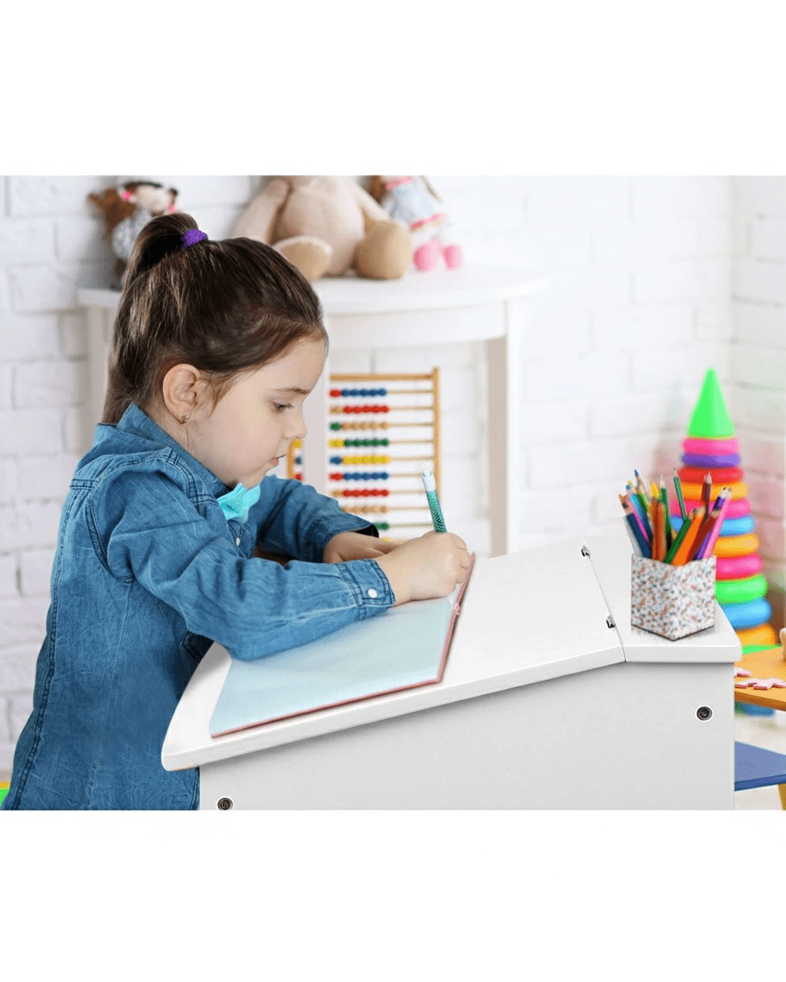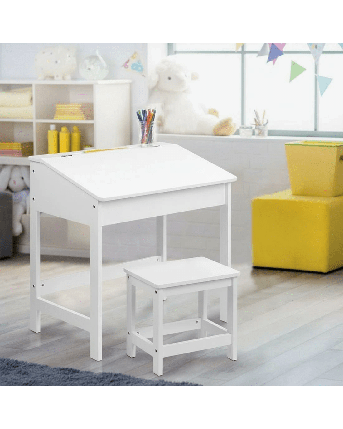 A bit of an old school charm and re-purposed for the modern era. That is what our Kids Lift-Top Desk and Stool intends to fulfill in a child's learning environment. By providing an appropriate and fun personal desk for him or her to spend their time creatively and wisely.