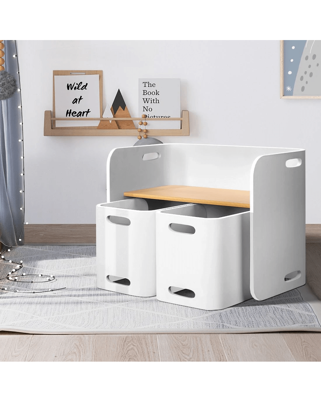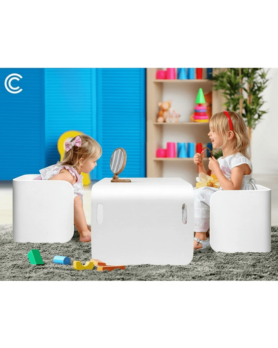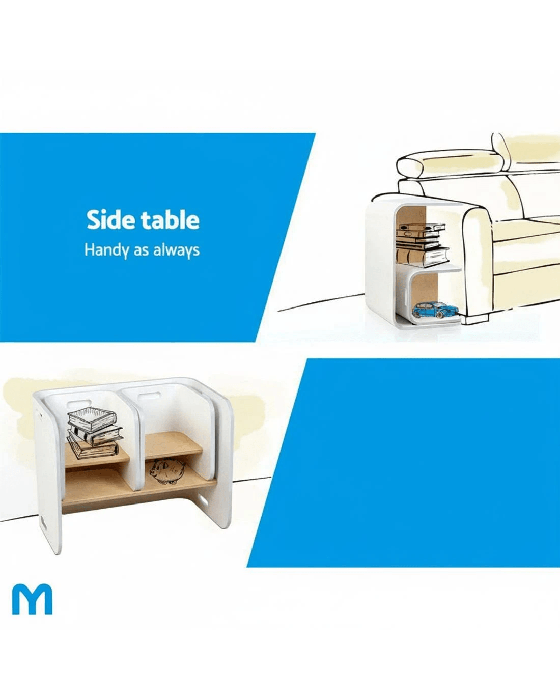 Give your kids they need to study, create and have fun with our compact Kids Table and Chairs Set. Made of birch plywood, the ensemble is strong and sturdy and designed to be child-safe with round corners, easy-grip handles and smooth surfaces. Perfect for reading, writing, art and craft or even having meals, the table has a weight capacity of 50kg. Likewise, the chair can take up to 50kg in weight and are made at just the right height and width for comfortable sitting. Not least, the set is easy to clean and maintain with its non-toxic finish. Its unique design also enable the set to be use in a variety of ways, such as a side table, storage shelf or even as a TV stand.