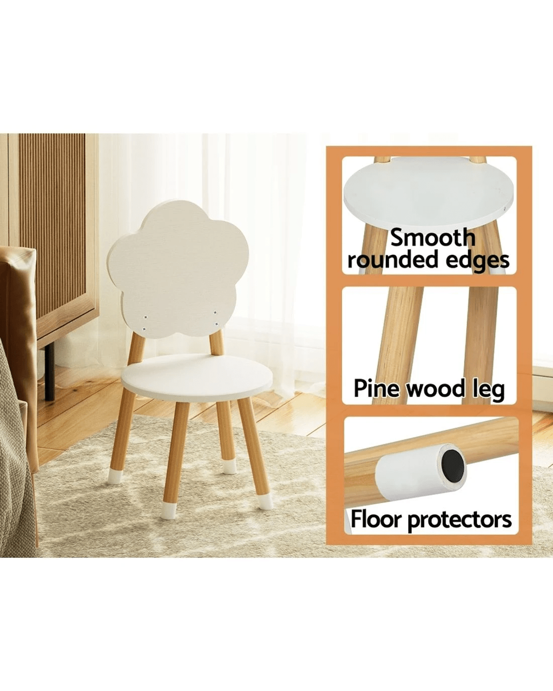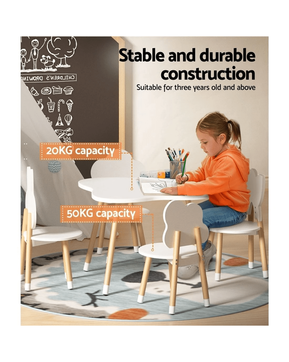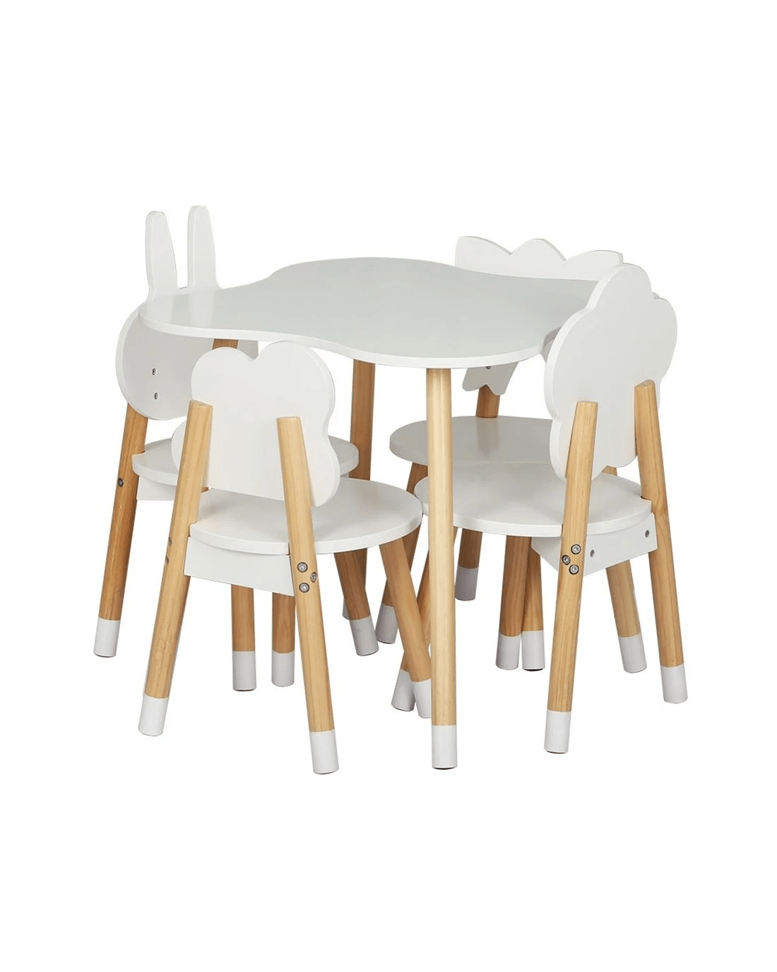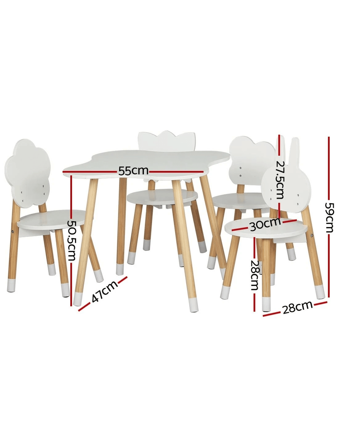 Create a creative zone for your kids to play, create, learn, and eat! Our Keezi kids' 5pcs table and chair set makes a perfect nook for your little ones to play, show off their creativity, do homework, and have meals like a grown-up. This gorgeous ensemble is extremely versatile and sure to add a creative touch to your kid's room with its attractive design. The chairs come in four beautiful shapes – rabbit, flower, cloud, and butterfly. Featuring a child-safe and convenient design, this set features sturdy MDF board construction for durability and longlasting use. Furthermore, it has solid pine wood legs for added stability and strength. The eco-friendly and non-toxic paint and smooth round edges make it safe for kids. This set flaunts a space-saving design allowing you to push the chairs inwards to save space. Our Keezi kids' table and chair set comes with four chairs and a wide table that allows your kid to play with mates comfortably. They have good weight holding capacity, which makes them extremely safe and versatile to use. Watch your kids have limitless fun and more giggles with their playmates!