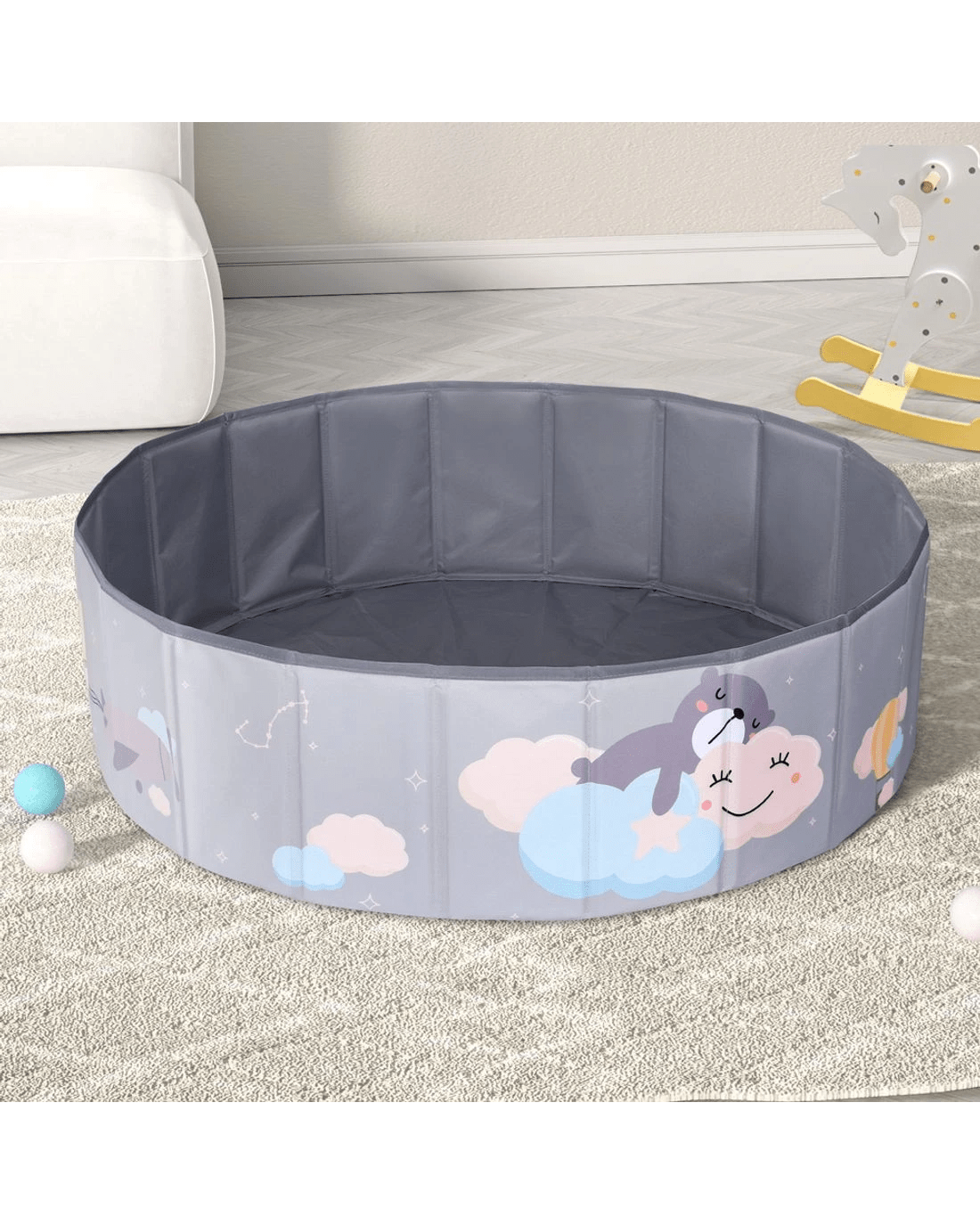Light up your kid's imagination and dive into fun with an easy breezy Keezi Ball Pool. Featuring a modern and sophisticated design, the round ball pool is a beautiful addition to any nursery, playroom or living room. Made from high-quality water-resistant Oxford cloth, the pool is soft, durable, and easy to use. This product has been EN71 safety approved, so you can rest assured your child has a safe and comfortable space to play. The pool can be assembled quickly and easily - no zips, clamps or clips are needed. When you're finished, simply fold it away and store it in the convenient carry bag. The pool has plenty of room for a single child 3-8 years old, so you can have fun for years to come. A top choice for your next children's birthday gift or summer activity, the Keezi Bal pool will delight children and parents alike and keep the whole family entertained. Get yours today!