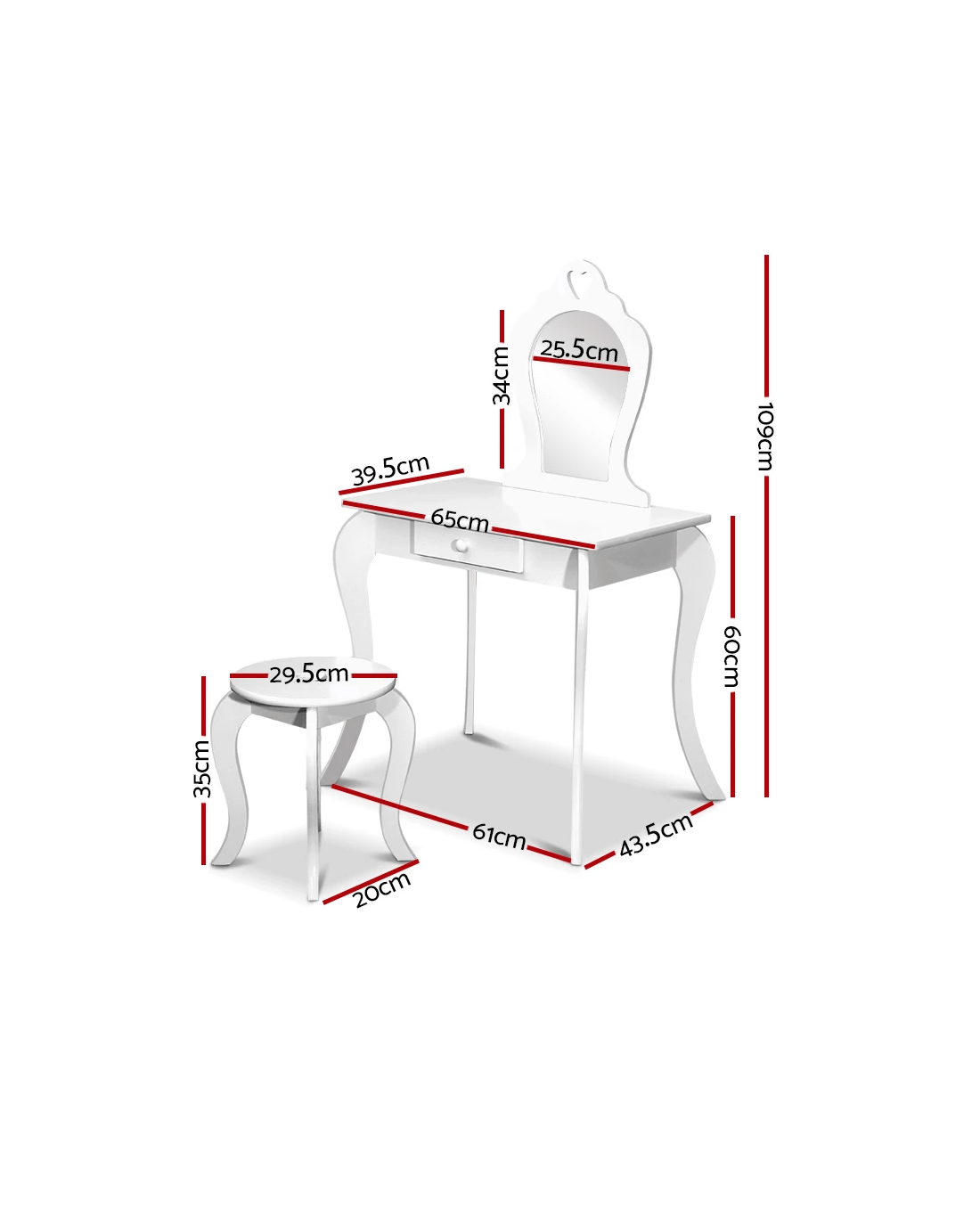 Certainly a dream come true for every little princess. Her very own makeup zone. And the Keezi Kids Dressing Table Set is just perfect for your girl to have a beautiful time doing her own makeup and getting ready for a fashionable start with her friends. The gorgeous set includes an elegant dressing table with a faux makeup mirror to reflect her awesome beauty. The large functional drawer also provides plenty of storage space for all her favourite accessories and more. Constructed with safe rounded corners and edges, the table and chair set is absolutely safe for use by your child and designed to handle robust use with its strong weight capacities.