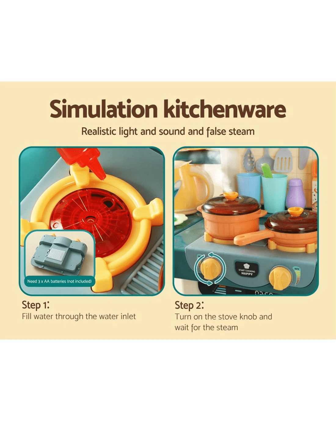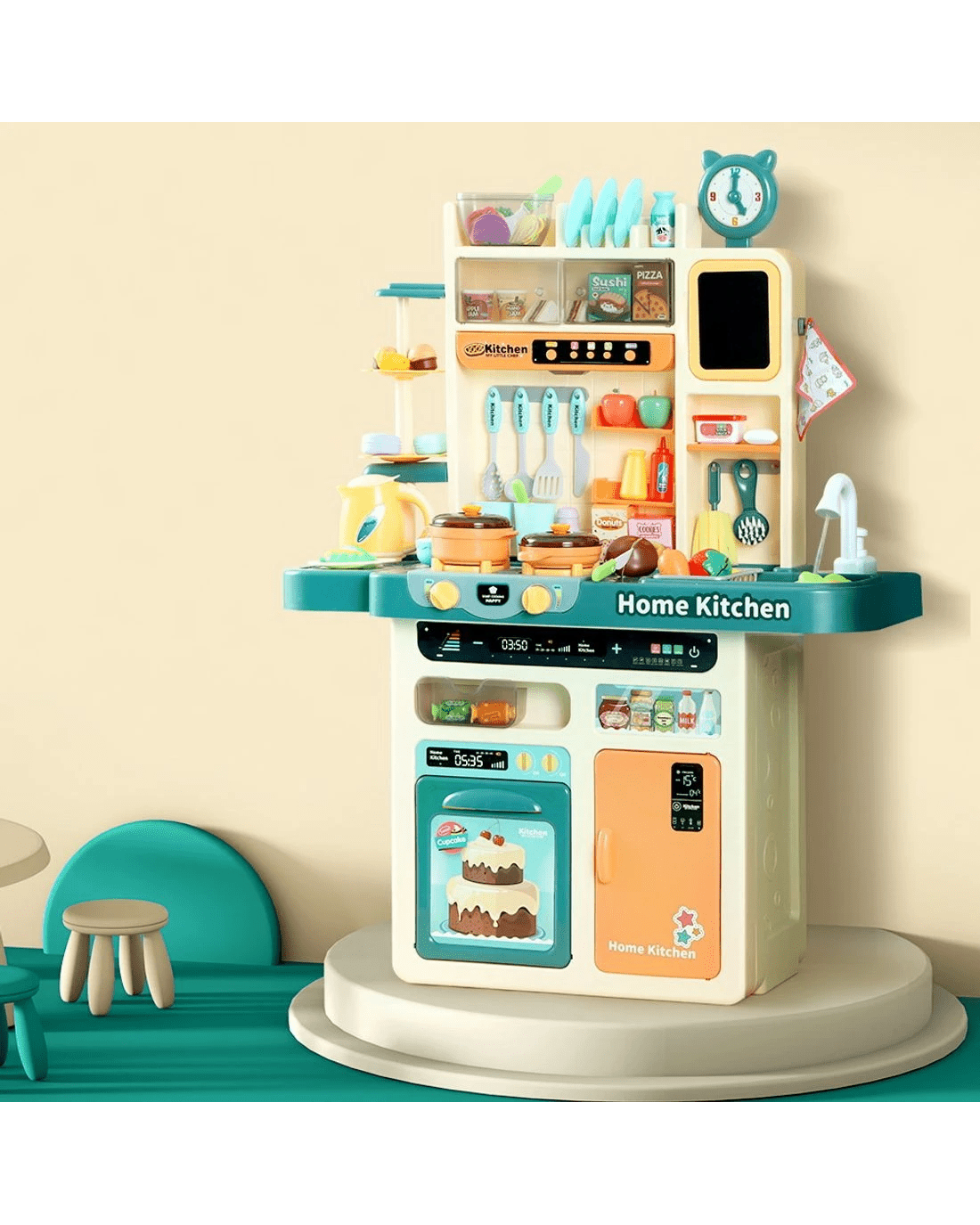 Our kitchen set comes with multiple simulation kitchenware and modern appliances, such as a real-like water outlet, non-hot false steam with lights and sounds, colourful fruits and veggies, multi-function rangehood with on/off, music, stories, fan, and volume control, and kitchen faucet with running water for a real-like cooking experience. It also comes with storage shelves and cabinets for neat and tidy kitchenware organisation and a real-like dessert stand with false sweet treats and decorative trays.
