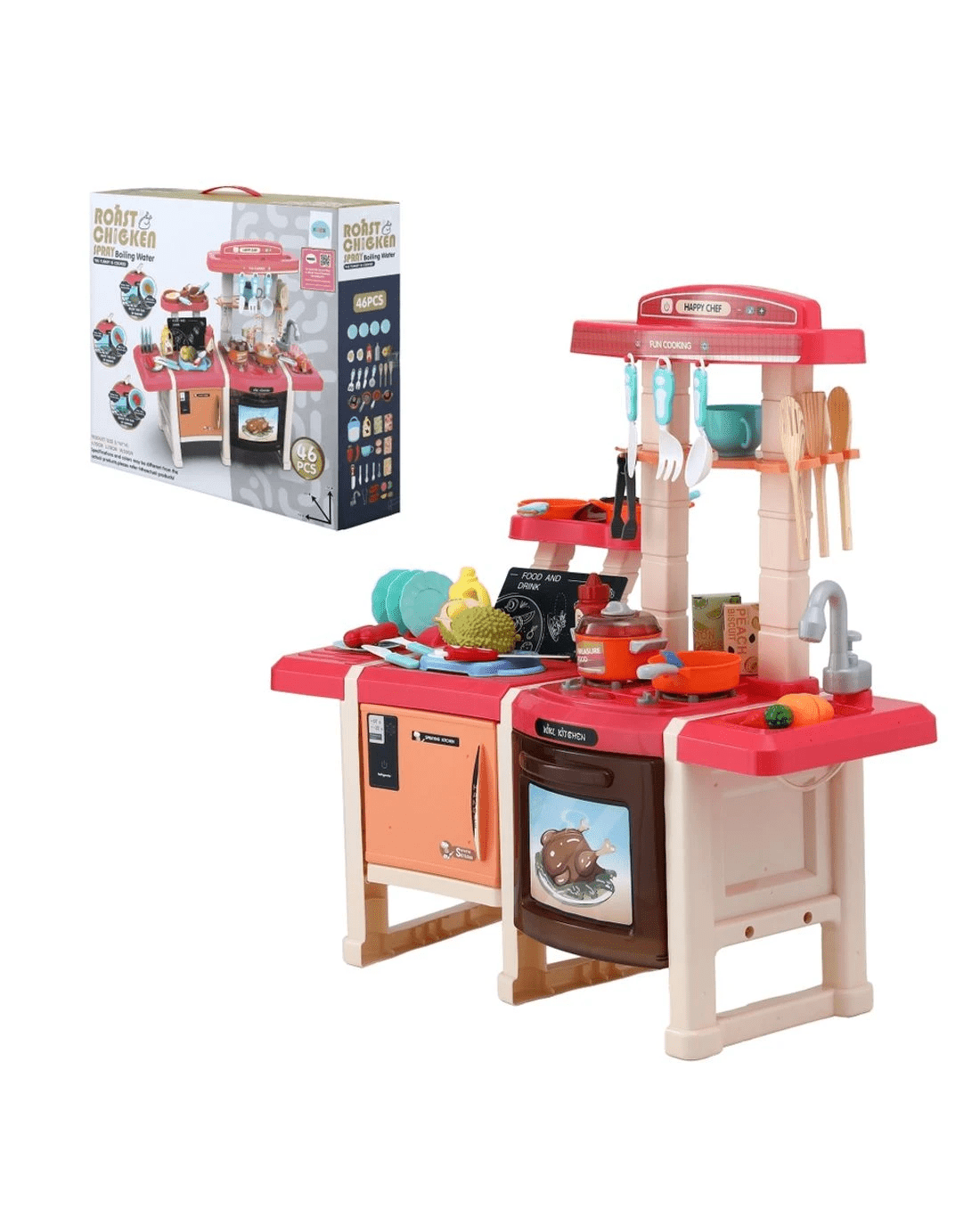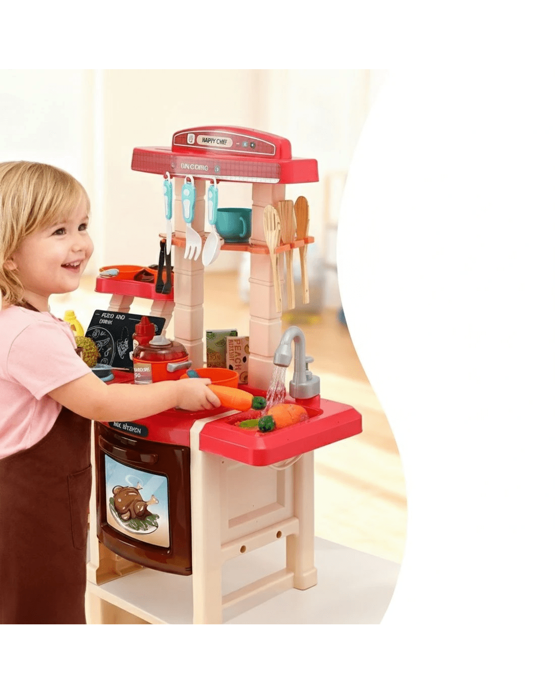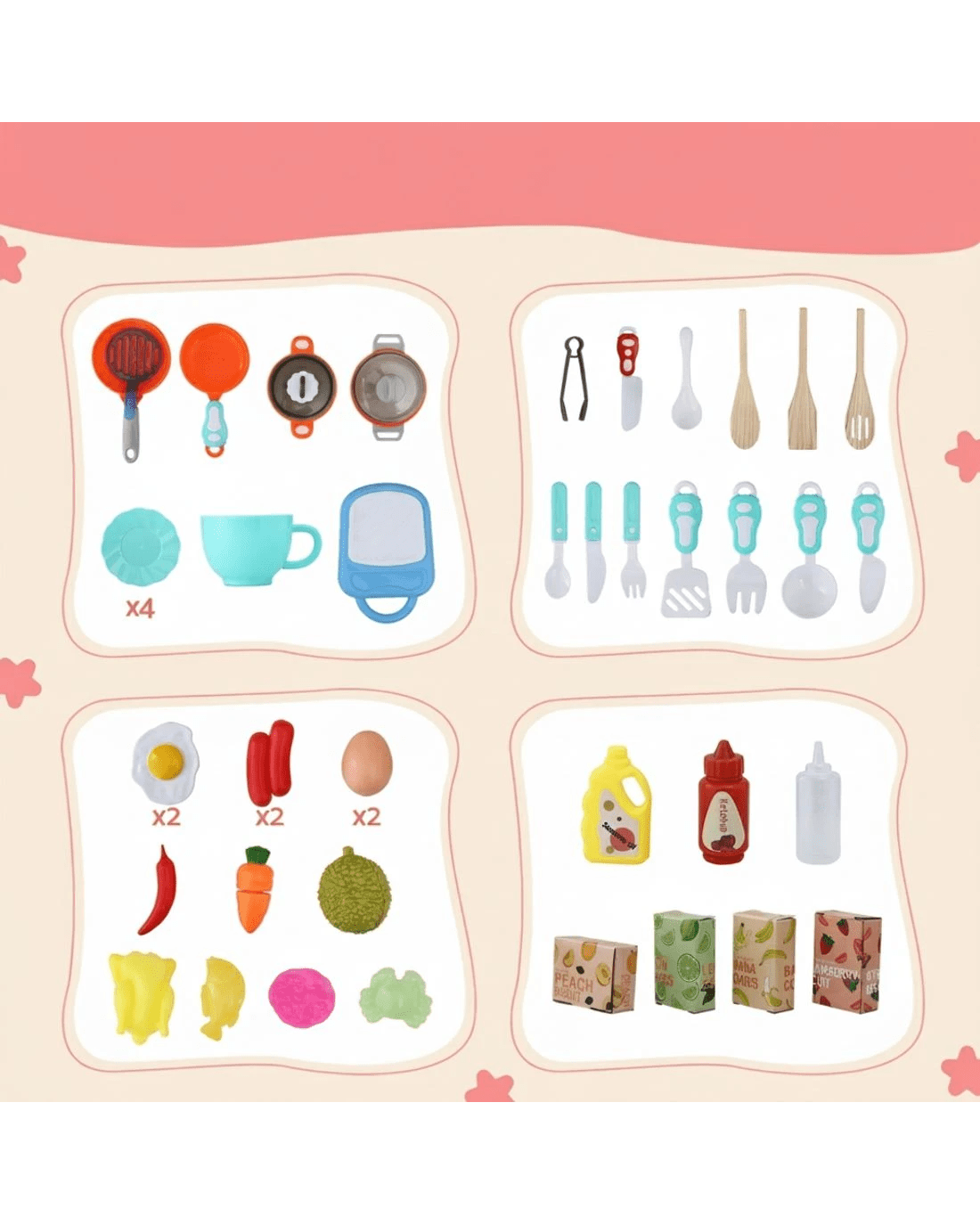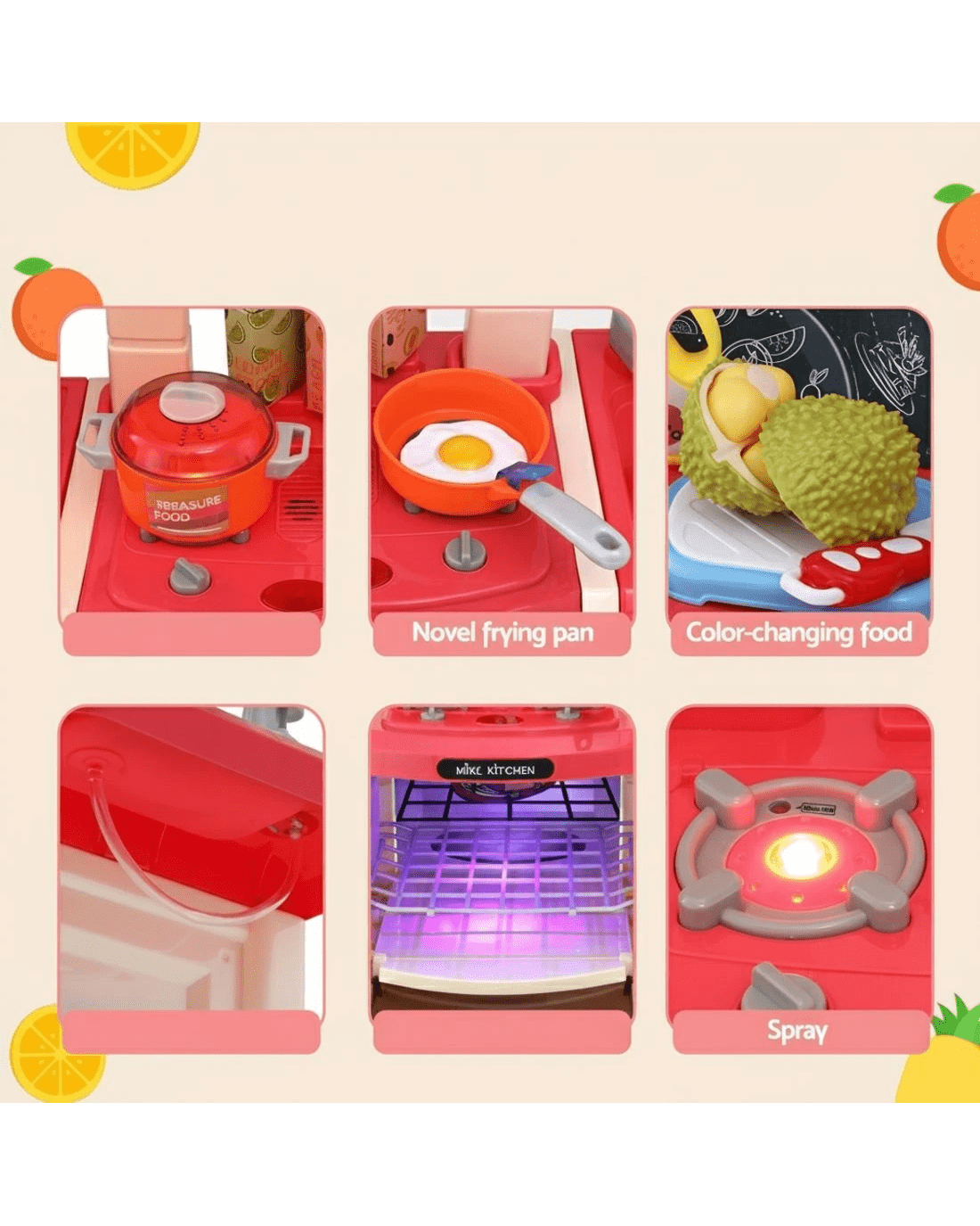Our kitchen set comes with multiple simulation kitchenware and modern appliances, such as a real-like water outlet, non-hot false steam with lights and sounds, colourful fruits and veggies, music, stories, fan, and volume control, and kitchen faucet with running water for a real-like cooking experience. It also comes with storage shelves and cabinets for neat and tidy kitchenware organisation and a real-like dessert stand with false sweet treats and decorative trays.
