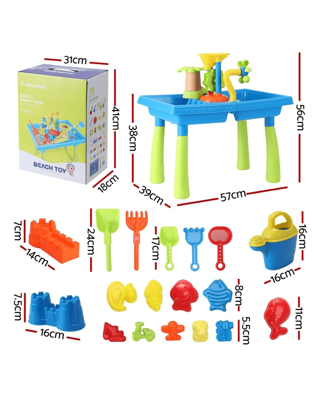 Your children will simply love our Keezi Sand and Water Table! With lots of individual pieces and many moving parts, the sand and water table takes your children into a world of marines, sand, sea and everything else in between. Suitable for children three years and older, the sand and water table is designed and made in accordance with EN71 Safety of Toys certification standards. That means it is completely safe for your children with total peace of mind. Not least, the toy is also made of non-toxic materials. Set it up in the backyard or bring it to the beach, the sand and water table's four-legged design ensures the assembly stays firm and steady on both sand and water despite its light weight. Your children will have a whale of a time playing with the waterwheel, rotating windmill and water slide. Neatly packaged in a colourful box, the sand and water table is the perfect gift for the season or any birthday event. Set sail with one today!