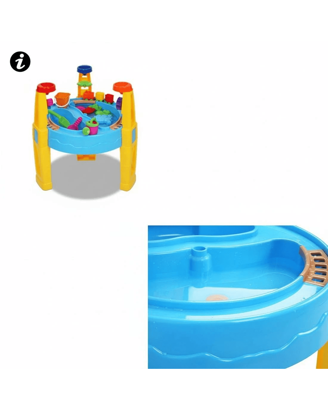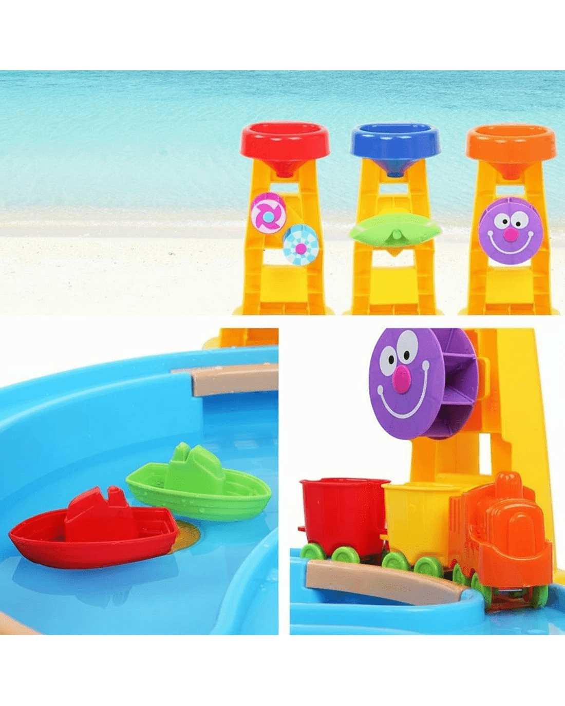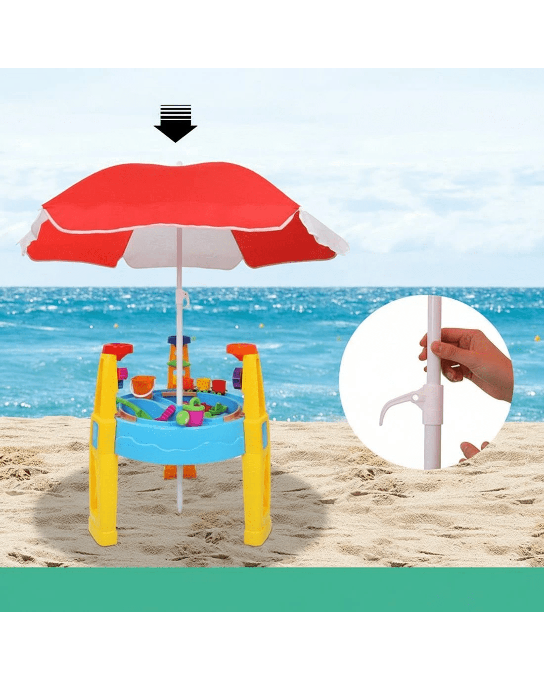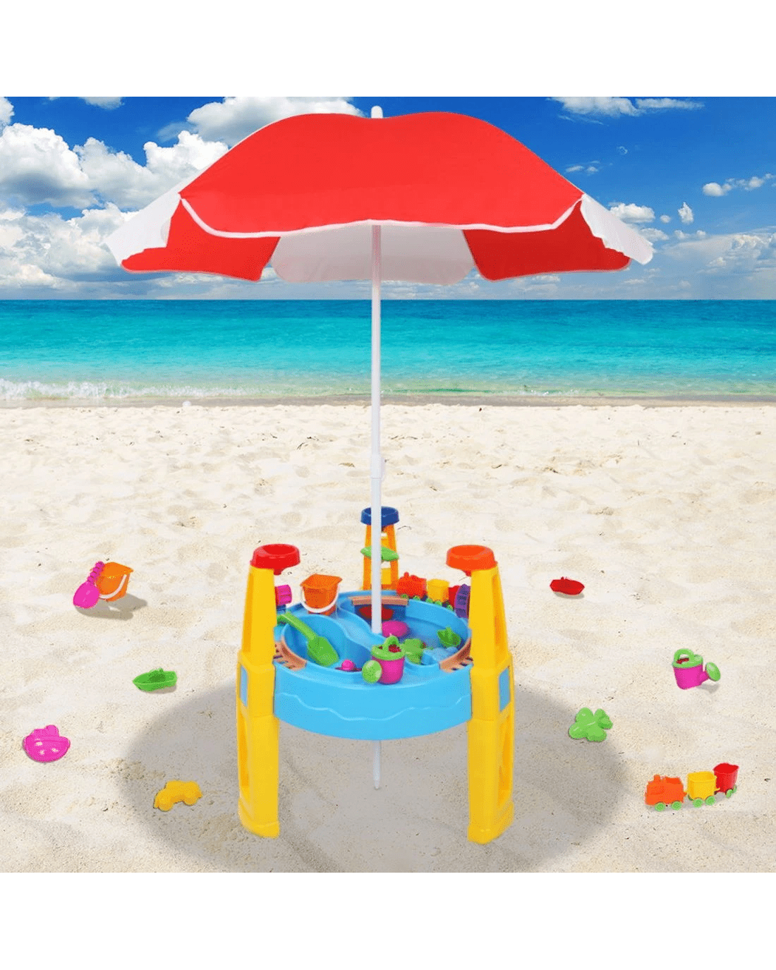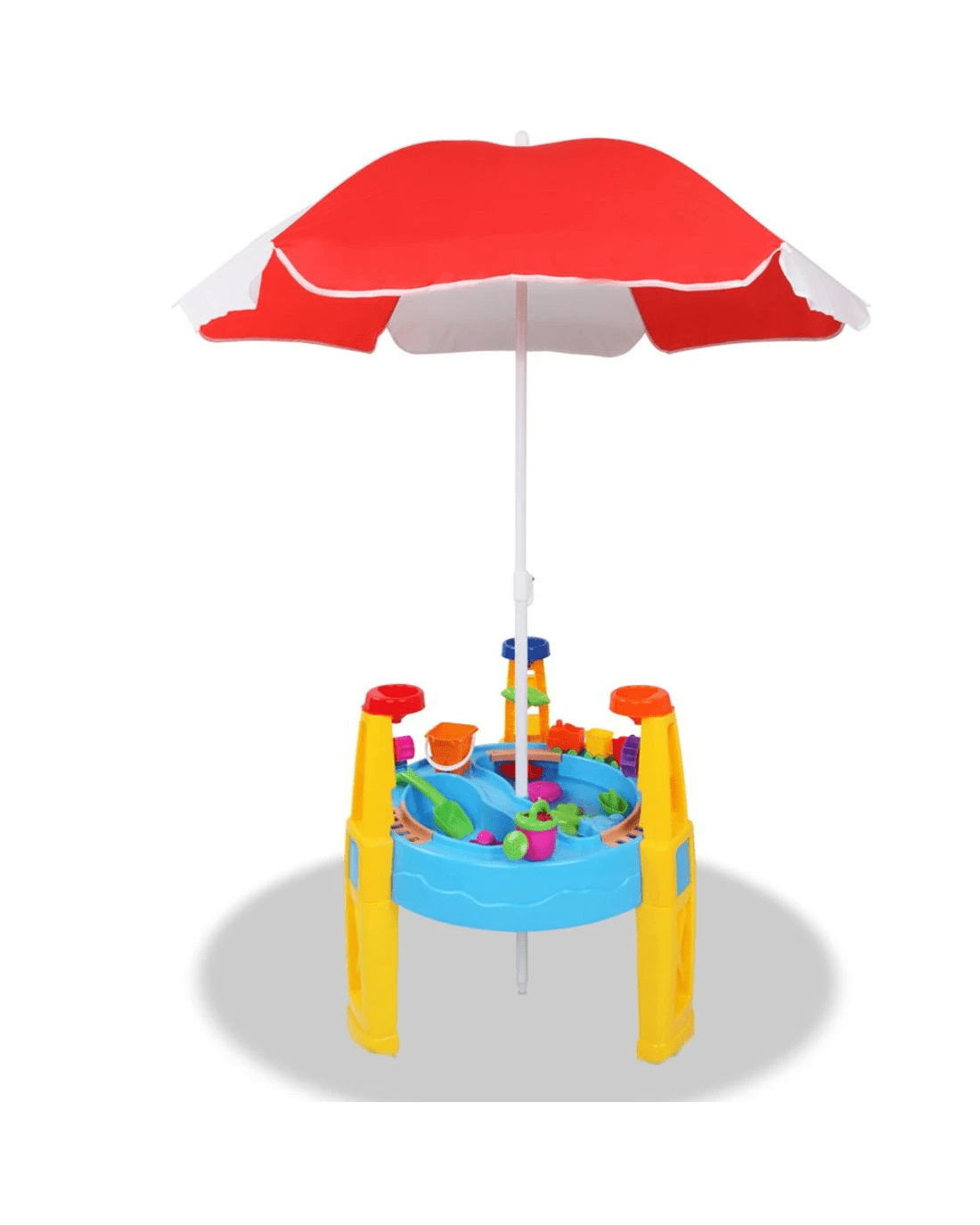 Unlike others, our 26-piece Sand and Water Table Play Set is made of non-toxic plastics with smooth and round edges that guarantee freedom of play in every way. Naturally, it's also great outdoor fun for kids three years and older as they immerse themselves in a world of creative imagination: building sand castles, steering the trains and letting the boats down the slide. The spinning water wheel and movable sand bucket add an extra dimension to play while other delightful pieces provide more fun under the sun. Or, if you prefer, under the shade with the detachable and adjustable height umbrella.