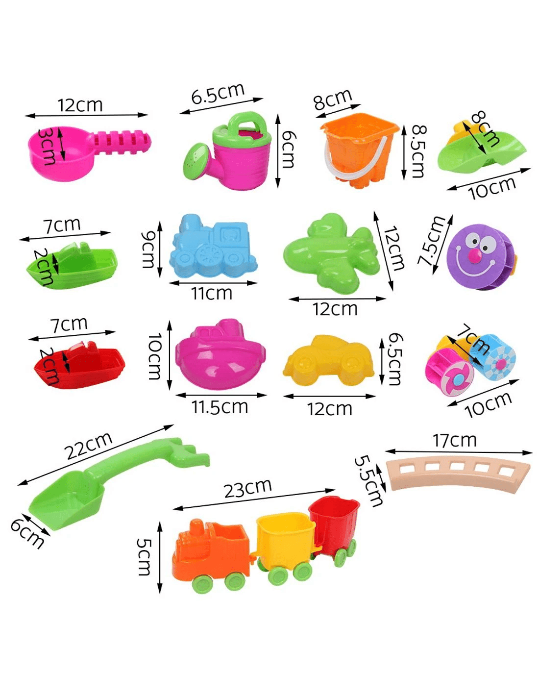 Accessories: 3 Trains, 2 Foor Drain, 3 Funnels, 4 Holders, 2 Boats, 2 Spinner, Spoon, Water Can, Bucket, Paddle Wheel, See-Saw Scoop, Shovel Rake, Umbrella