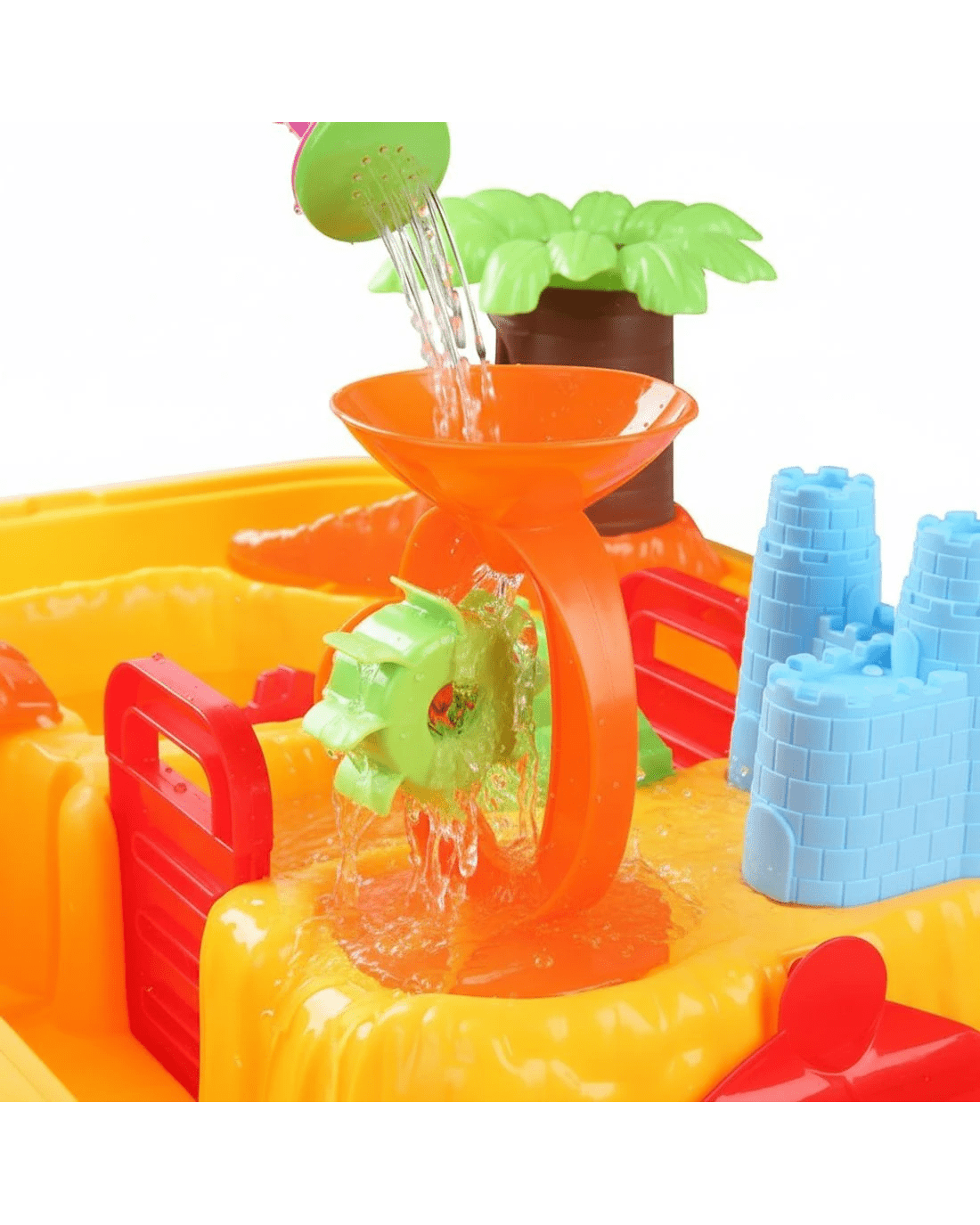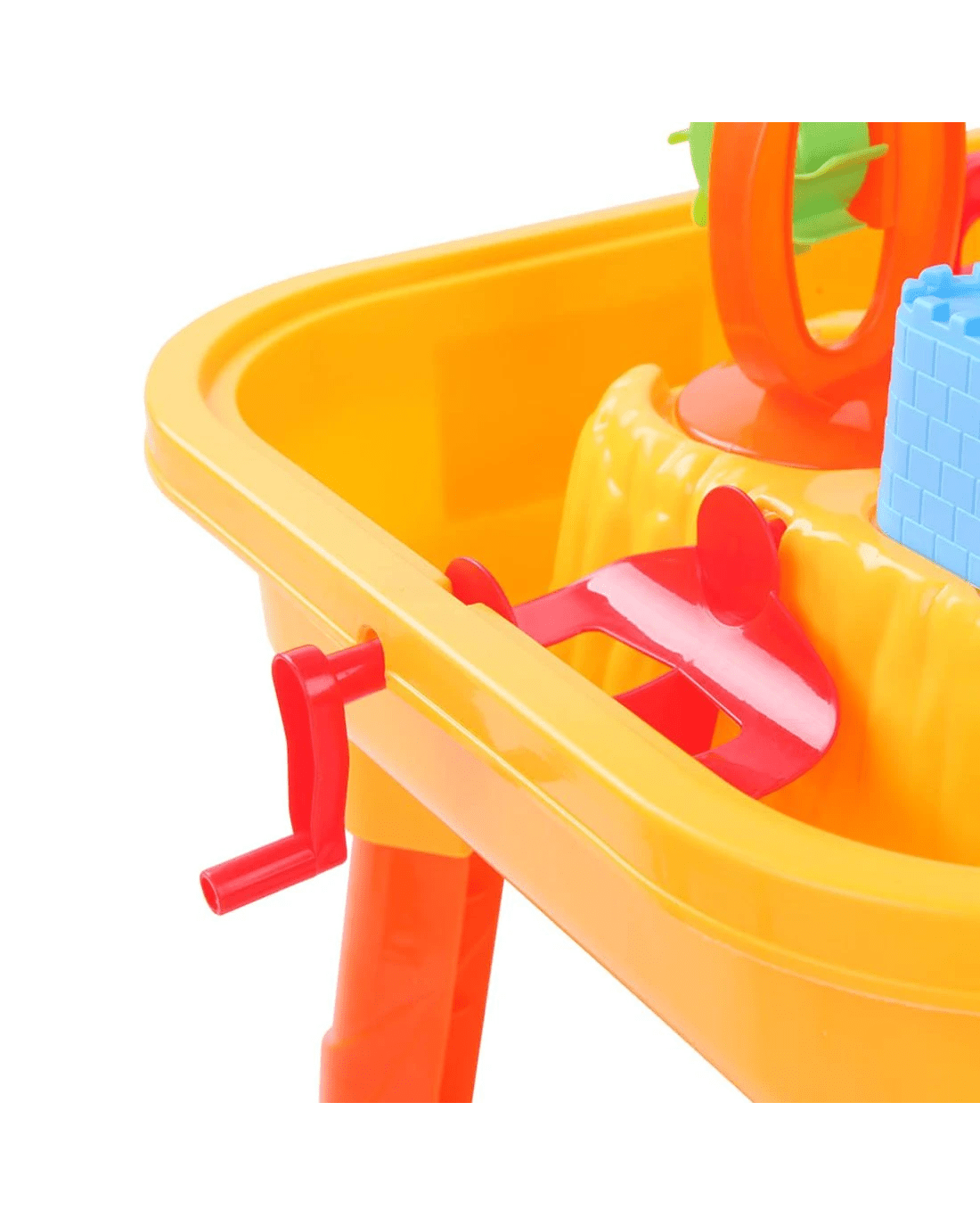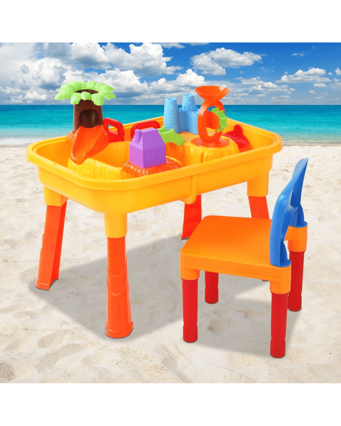 Included: Table, Chair, Table cover, Waterwheel,, Sand glass, 2 Boats, 2 Gates, Trunk, Leaves, Water roller, Bridge, House, Castle, Water can, Spoon, Shovel rake, Bucket, 2 Sand moulds