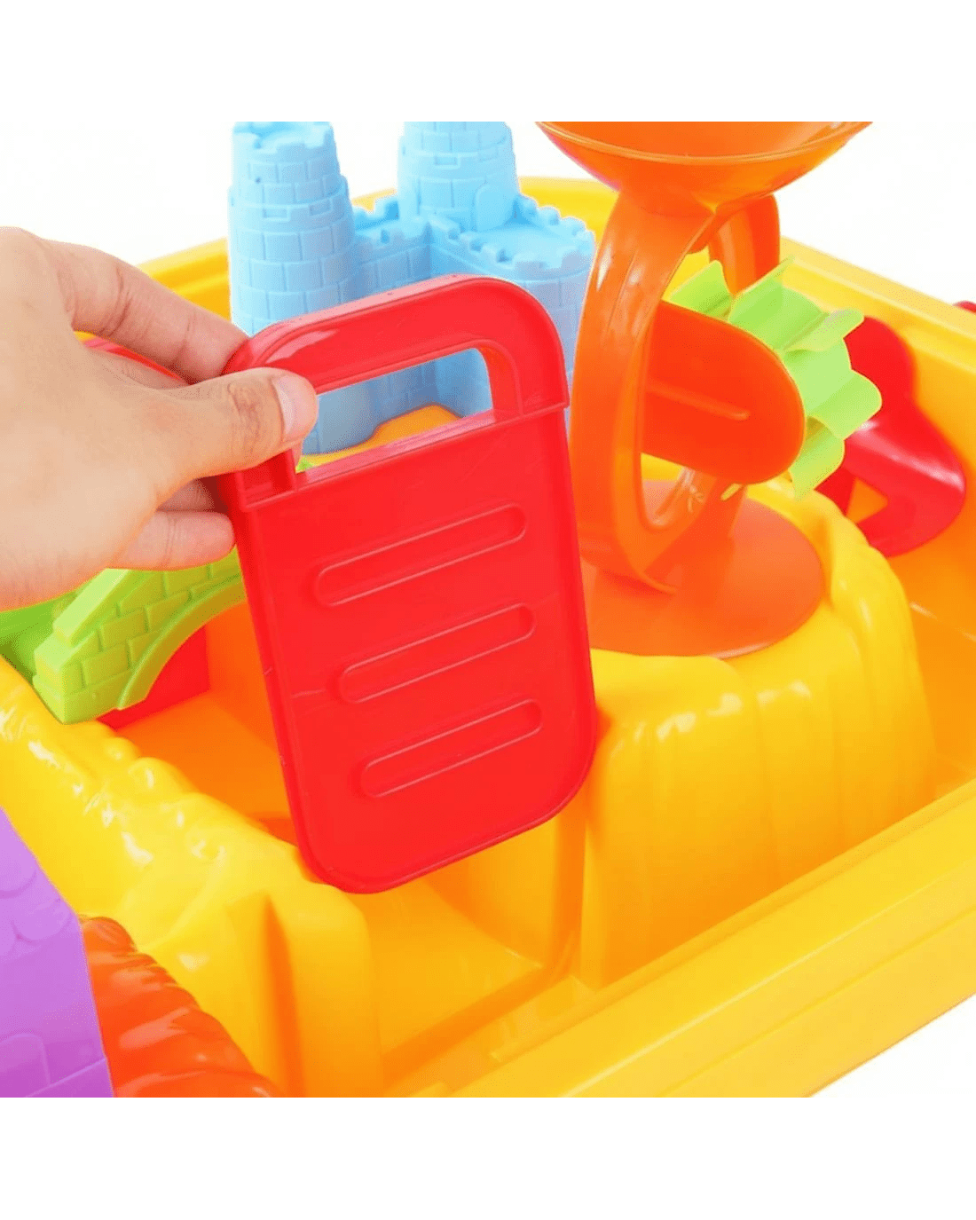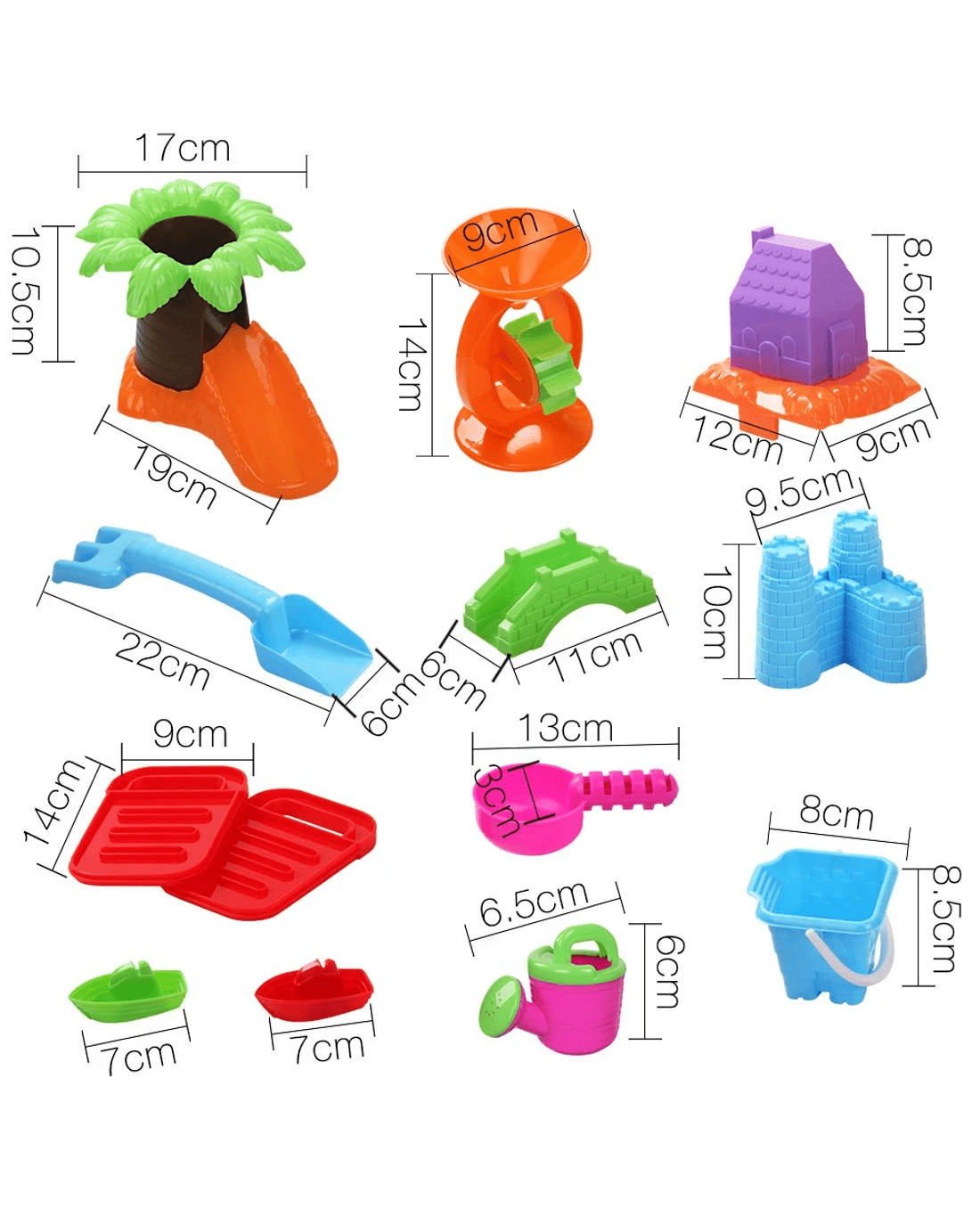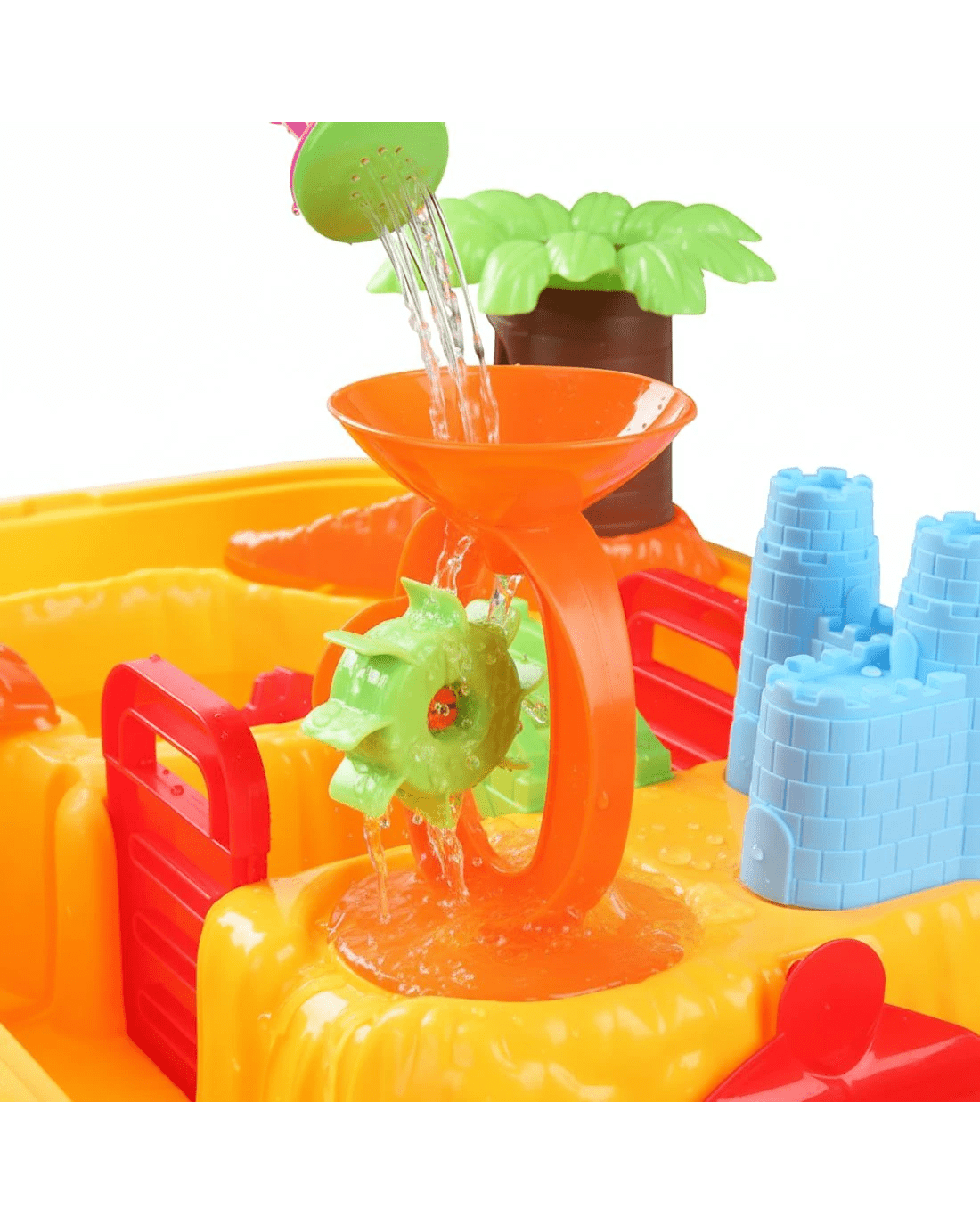 Included: Table, Chair, Table cover, Waterwheel,, Sand glass, 2 Boats, 2 Gates, Trunk, Leaves, Water roller, Bridge, House, Castle, Water can, Spoon, Shovel rake, Bucket, 2 Sand moulds