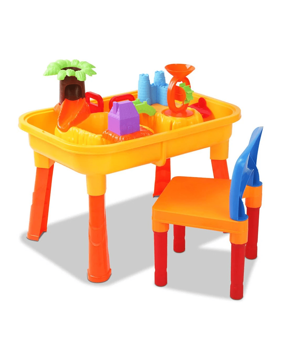 Complete with table and chair, the vibrant and colourful Sand and Water Table Set features various play things for your child to develop their creativity. Fill the Table with sand and water and watch your child have fun with the movable water wheel and sand tipper or building sand castles and the like with the sand moulds, shovel, rake and bucket. There are also little boats and other engaging toys to offer hours of intriguing play with every push, twist, slide and turn.