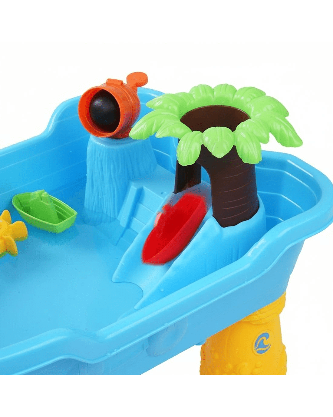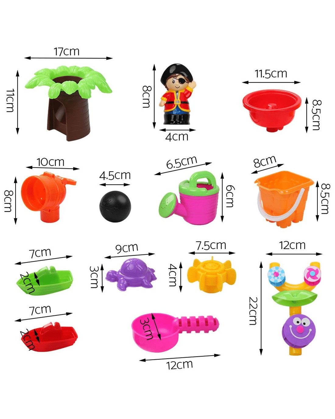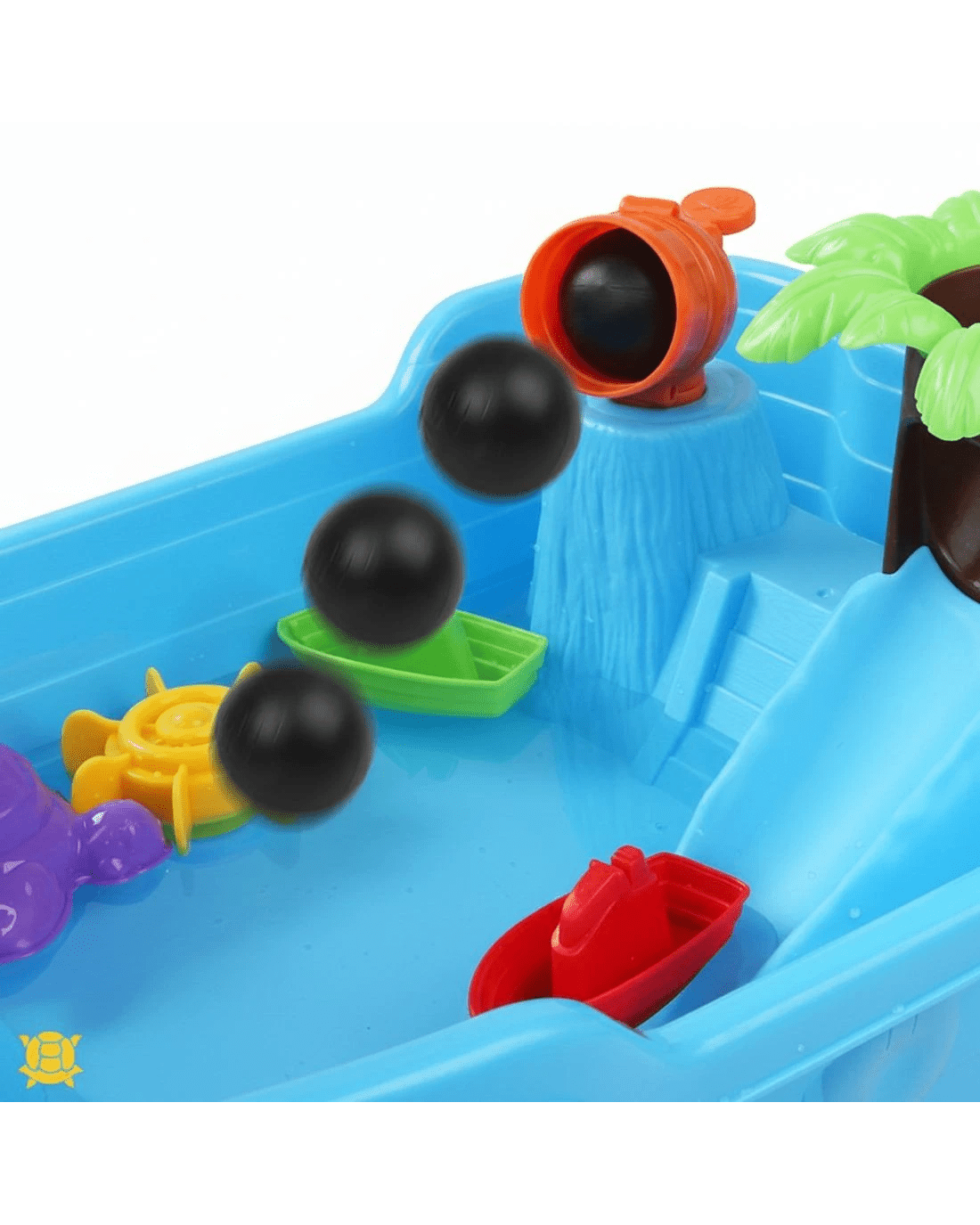 Accessories: Sail, Trunk, Leaves, Buckets, 2 Boats, 3 Holders, Water can, Spoon, Hourglass, Captain, Pirate Boat, Propeller, Tortoise sand mould, Cannon, Cannon ball, Water wheel