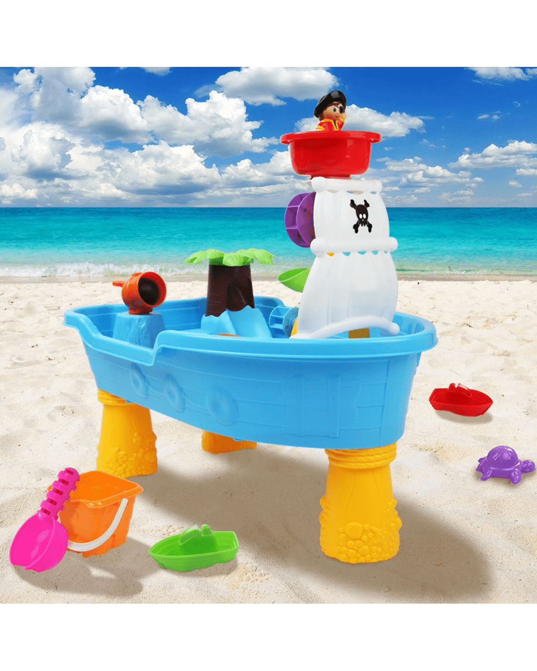 Your kids will simply love this 20-piece Pirate Ship Sand and Water Table! With lots of individual pieces and many moving parts, the Pirate Ship Sand and Water Table takes your kids into a world of pirates, sand, sea and everything else in between.