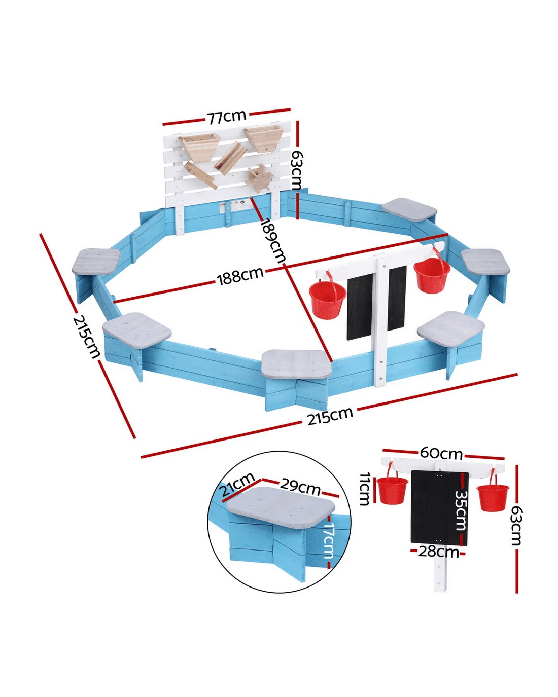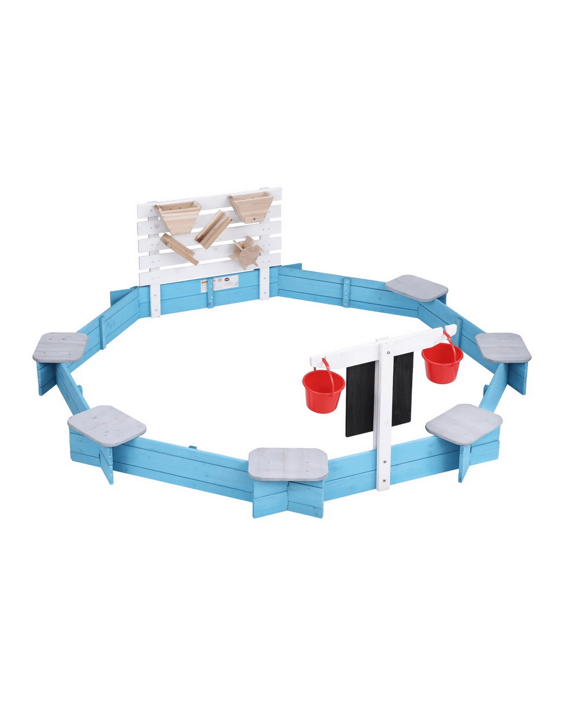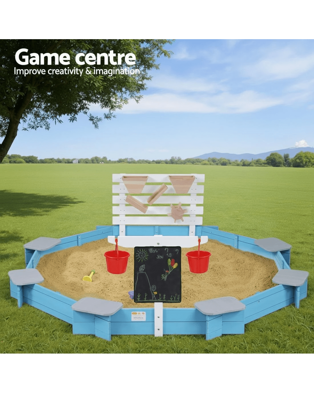Create the ultimate backyard play zone with the Keezi Kid Sandpit, designed to spark imagination and active fun. Built from strong, treated timber for long-lasting use, this spacious sandpit can comfortably host up to six children. It comes complete with a sand funnel, spiral, two buckets, and a drawing board to encourage creative and interactive play. The comfortable seating area allows kids to rest between activities, while the treated timber offers protection against wood rot and insect damage. Certified to EN71 Toy Safety standards, the Keezi Kid Sandpit is the perfect way to combine outdoor exercise with hours of entertainment.