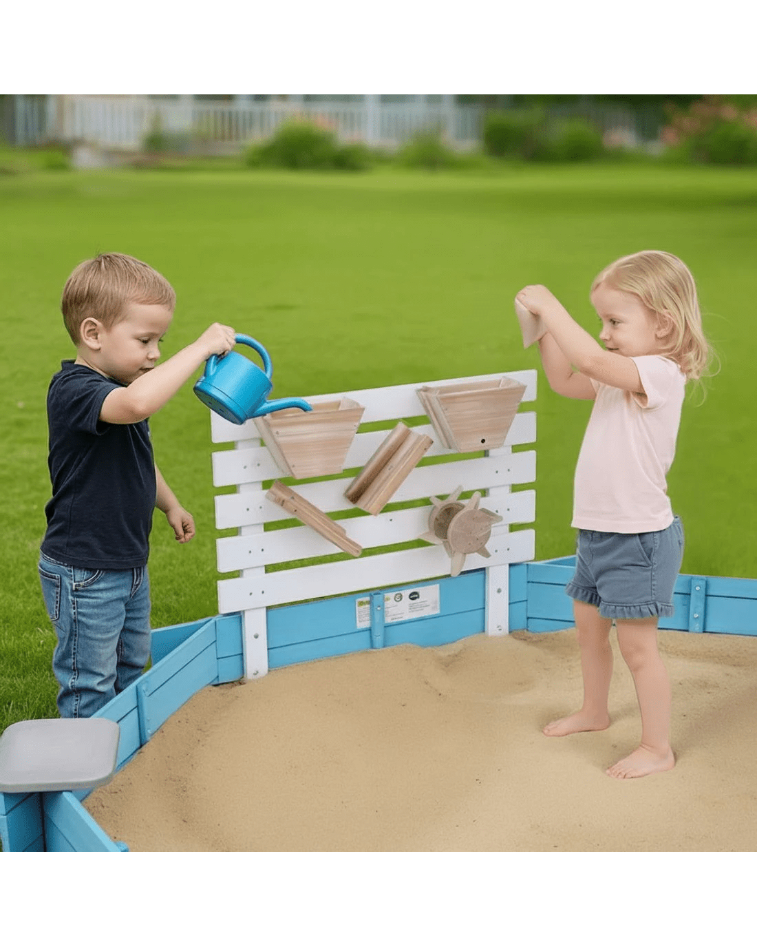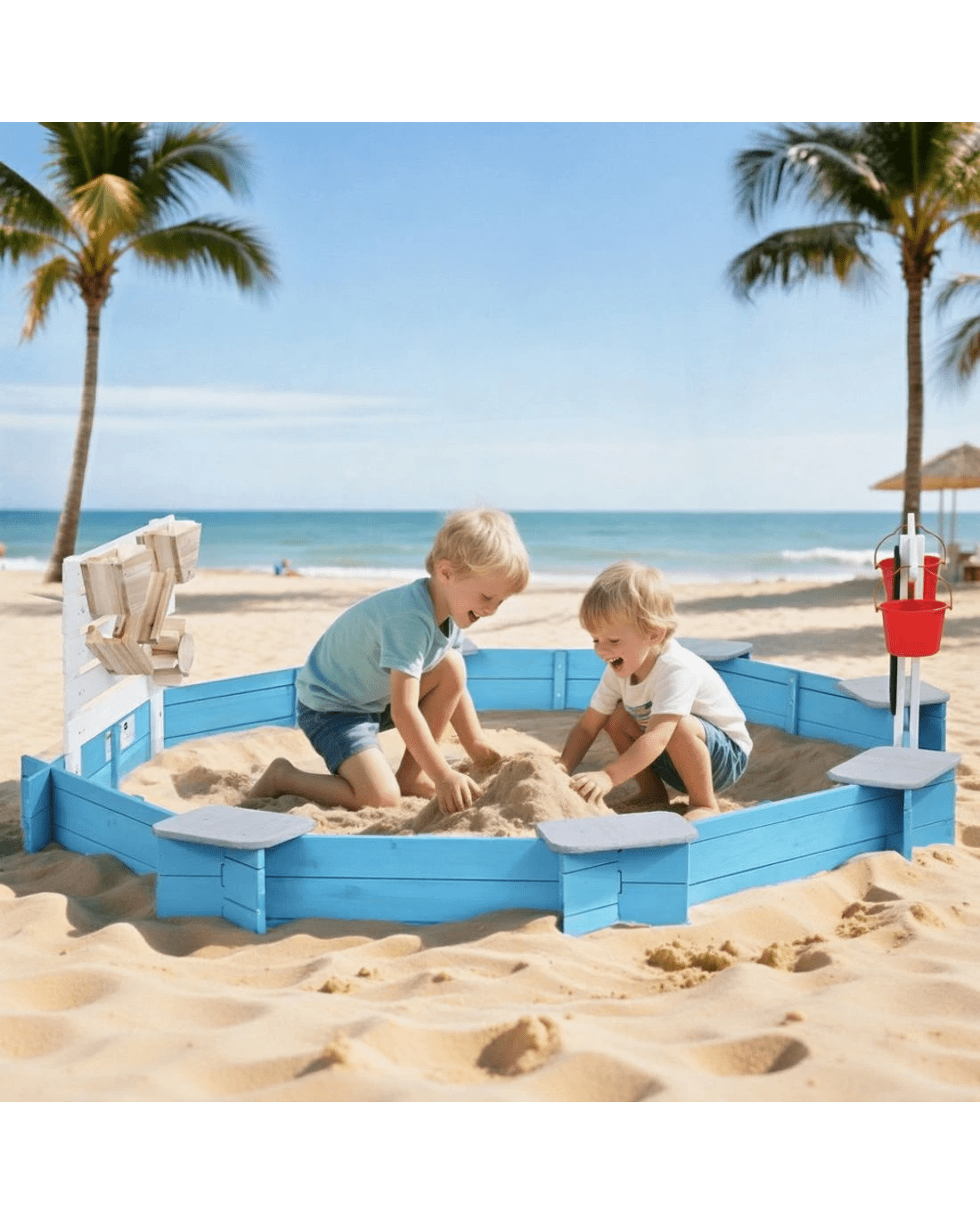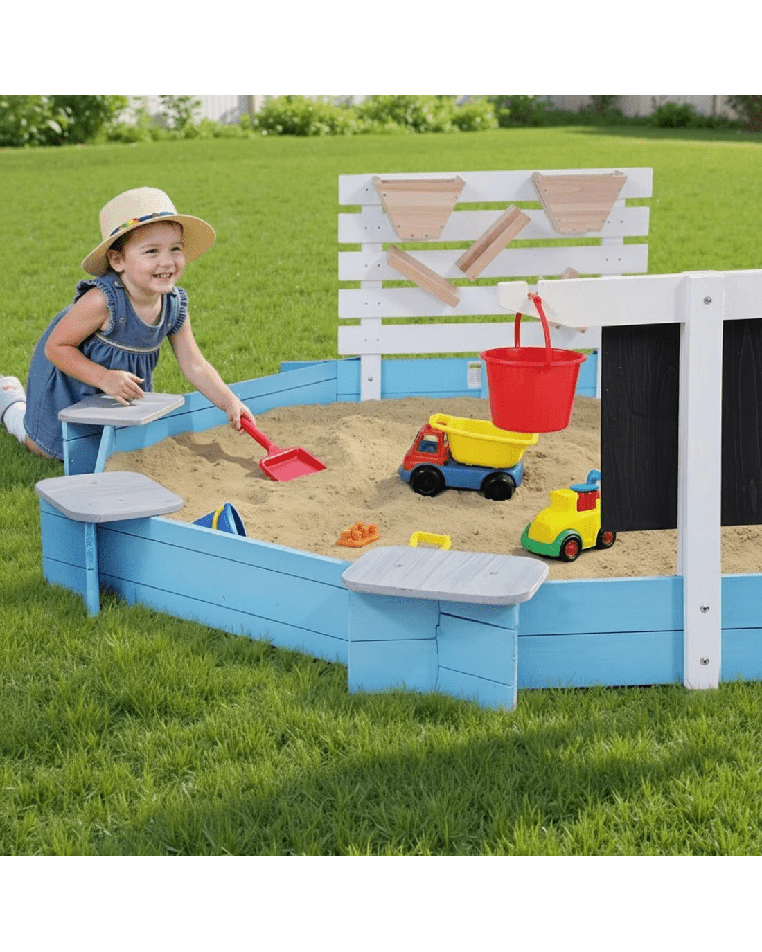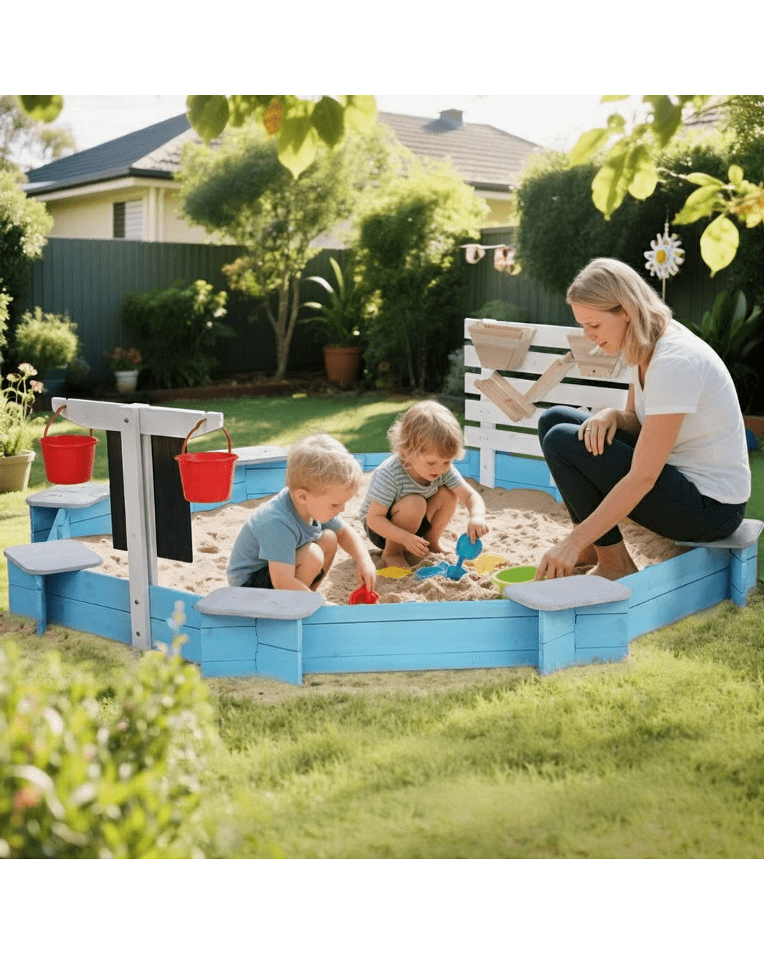 Create the ultimate backyard play zone with the Keezi Kid Sandpit, designed to spark imagination and active fun. Built from strong, treated timber for long-lasting use, this spacious sandpit can comfortably host up to six children. It comes complete with a sand funnel, spiral, two buckets, and a drawing board to encourage creative and interactive play. The comfortable seating area allows kids to rest between activities, while the treated timber offers protection against wood rot and insect damage. Certified to EN71 Toy Safety standards, the Keezi Kid Sandpit is the perfect way to combine outdoor exercise with hours of entertainment.