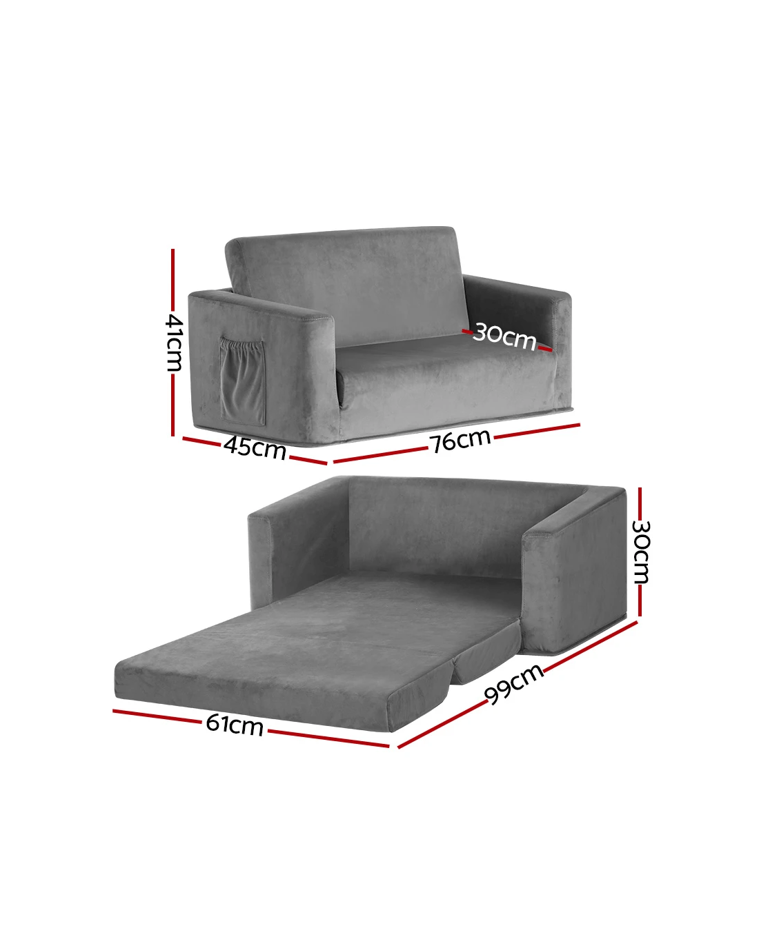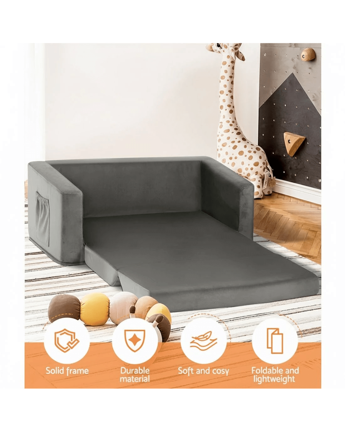 Featuring 2-in-1 design, our kids sofa folds out into a bed. It can accommodate two to three kids. Upholstered in premium fabric, our kids sofa features solid wooden construction for durability and sturdiness. The high elasticity sponge padding makes the seat comfortable, soft, and cosy and offers excellent back and seat support. Furthermore, the padded armrests with side pockets add to your comfort and convenience.