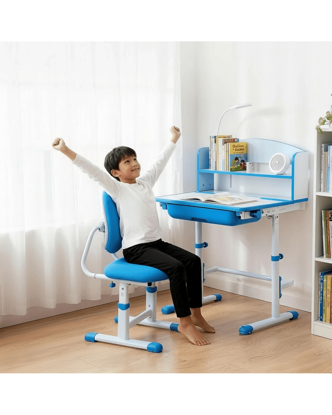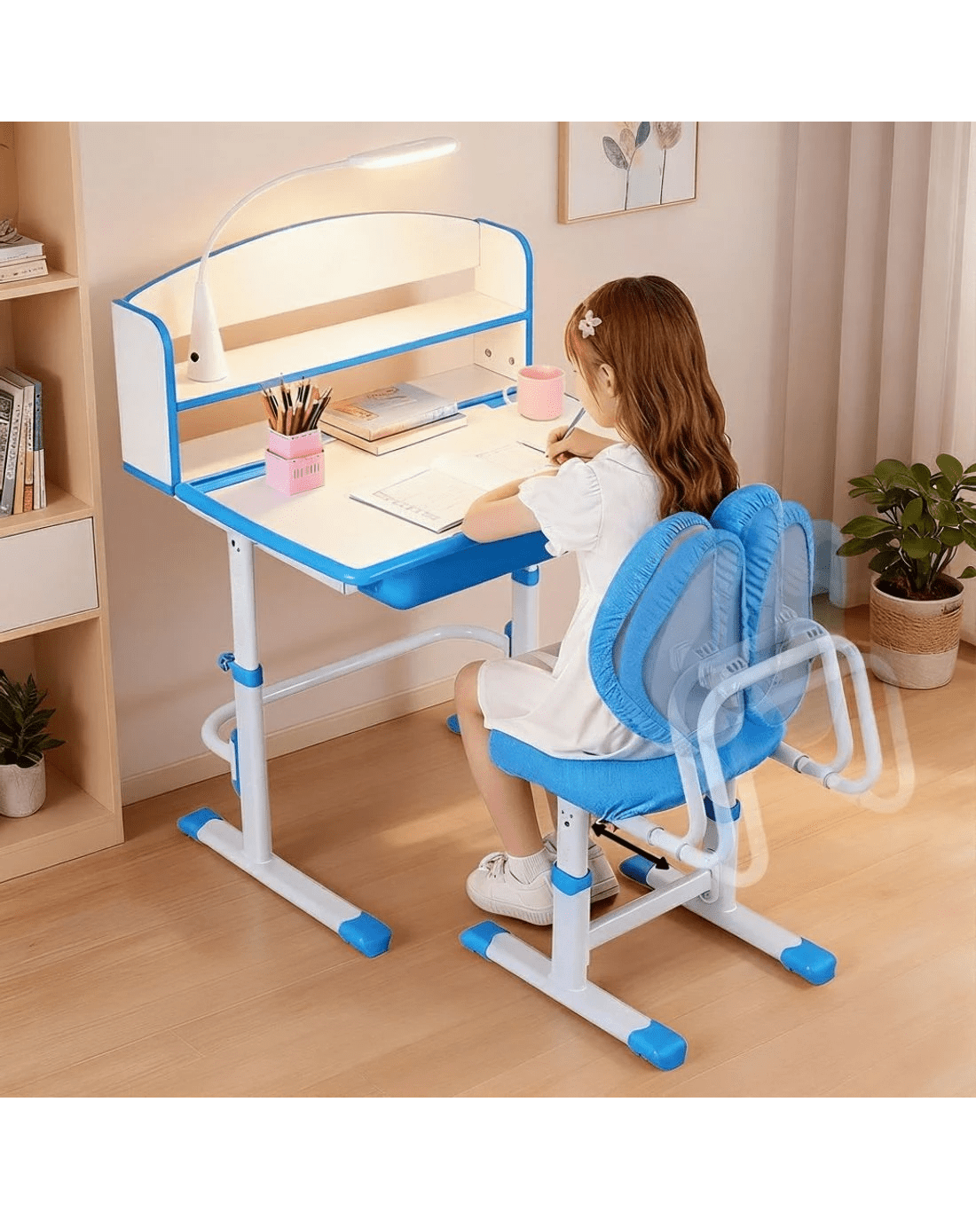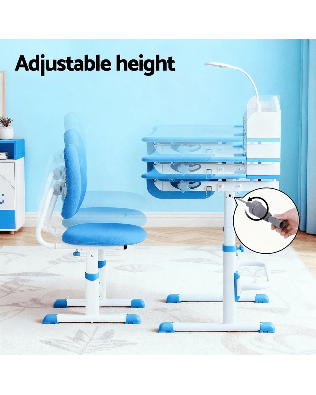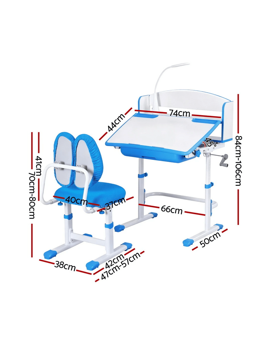 Give your child the perfect space to learn, create, and grow with this Keezi Ergonomic Kids Study Desk and Chair Set. Designed to grow with your child, both the desk and chair are height adjustable using a simple hand crank. The tiltable desktop can be adjusted for reading, writing, or drawing, promoting good posture. This set is packed with features, including a pull-out storage drawer for stationery, a hook for a handbag, and a built-in LED lamp for focused study. The ergonomic double-back chair provides excellent support, ensuring comfort for long study sessions.
